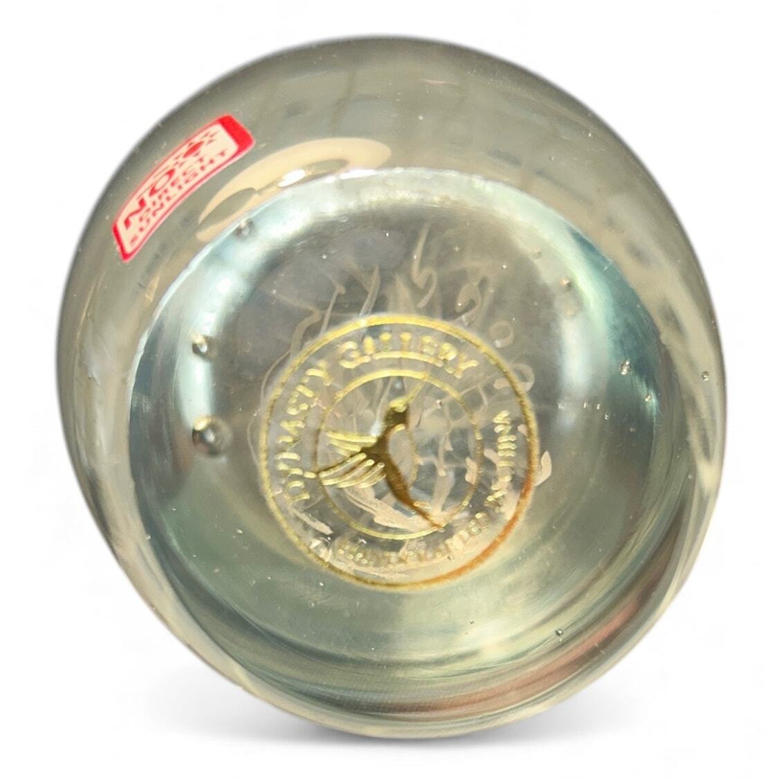 Handcrafted from multiple layers of molten glass, this glass paperweight showcases the free-floating and ethereal qualities of jellyfish. After absorbing light, it continues to captivate with its glow in the dark properties.