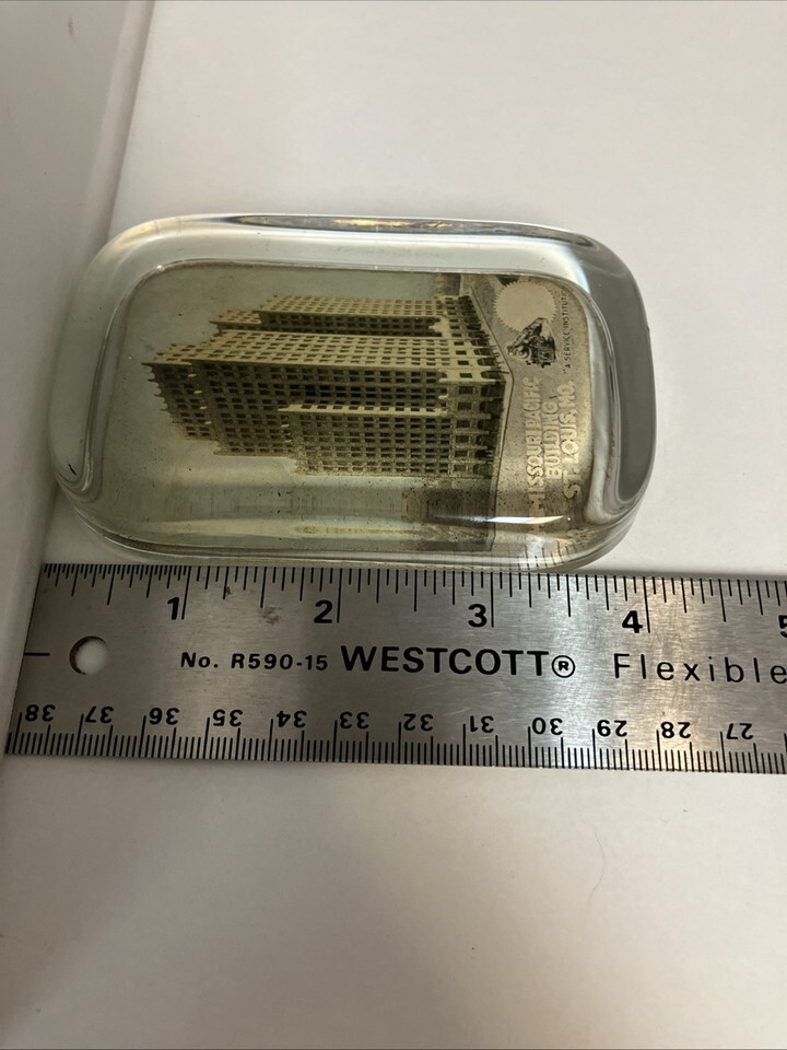 The product is a vintage glass paperweight featuring the Missouri Pacific (Club) building in St. Louis, Missouri. This collectible decorative item showcases a piece of United States history and architecture. Made of glass, it serves as a unique and eye-catching addition to any collection or as a stylish decorative piece in a home or office setting.
