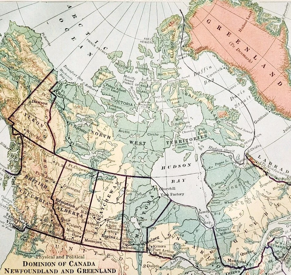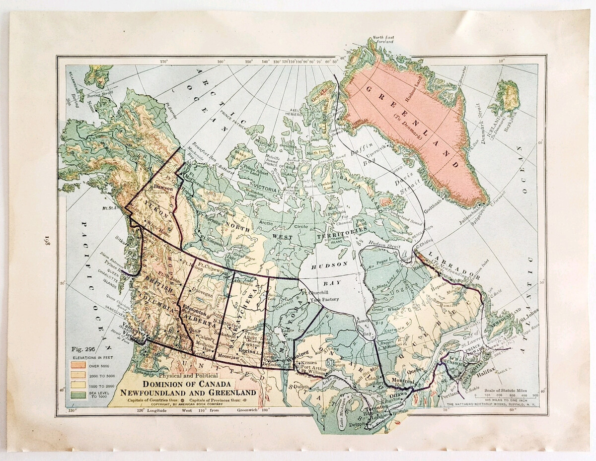 1916 Map Canada Dominion Newfoundland Greenland Physical Political DWSS15