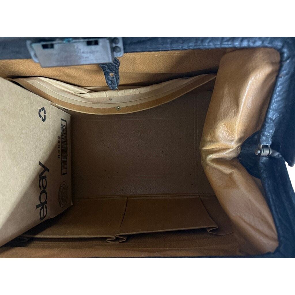 Wonderful Antique Victorian Cowhide Doctor Satchel Bag Extra Large Elephant Hide? Suitcase measuring 18" x 11" x10", not including handles. It is lined in leather, and the lining is in great shape overall. Outside, unfortunately, is shedding on the edges. It has an alligator hinge-type opening with a push button and double latch closure. NOT ZIpper. You might be able to spray the edges with lacquer to keep them from shedding. The hide itself seems to be ok. It is a bit dry and the case is hard to keep open, but it can work as a prop or decor or be used if treated. A fabulous piece of medical history!