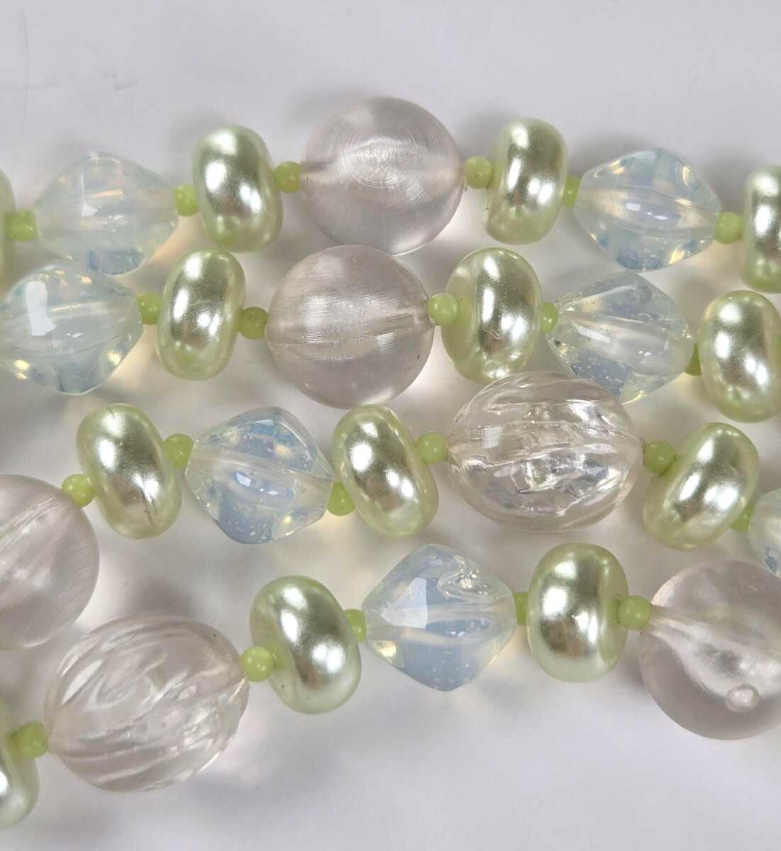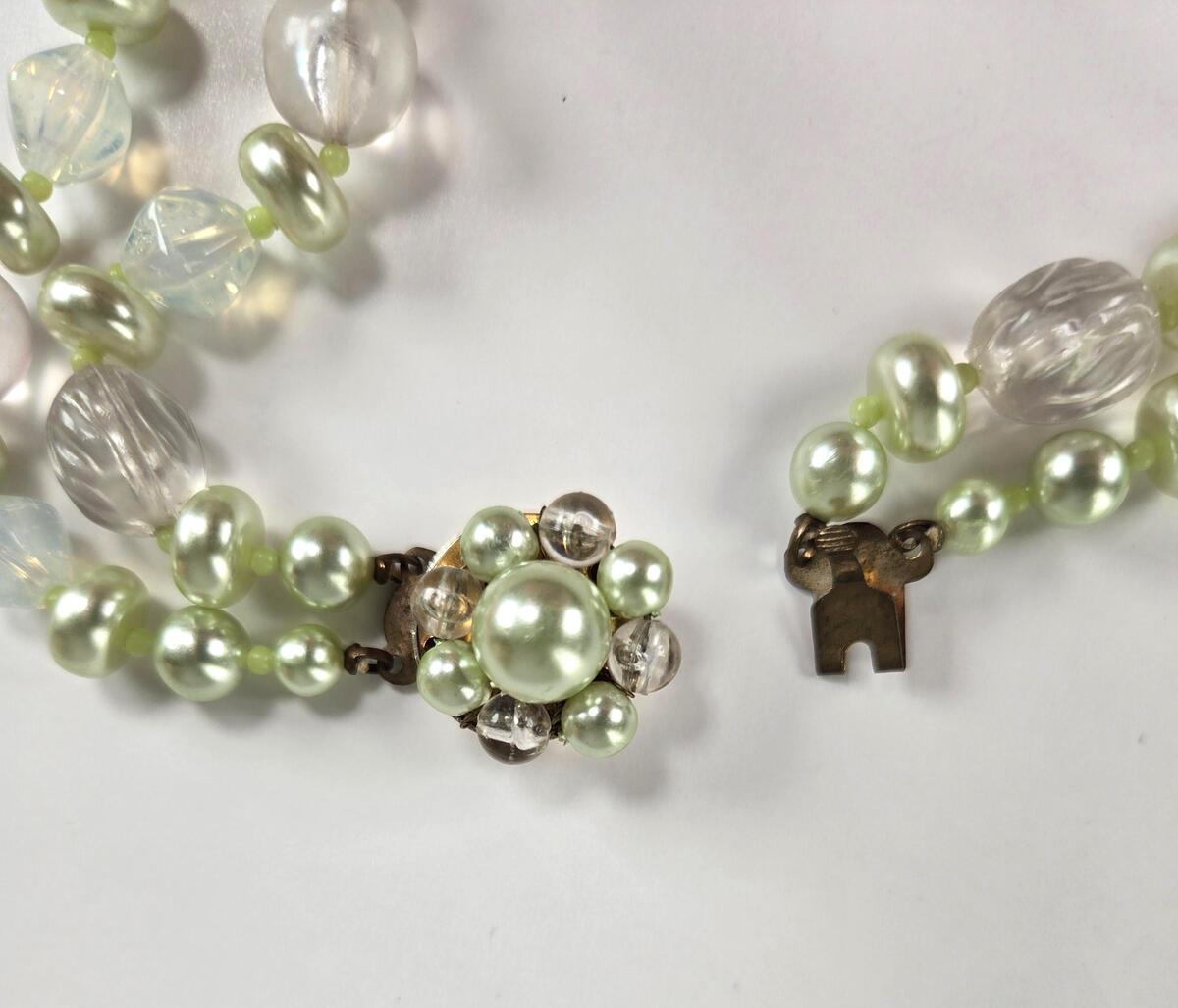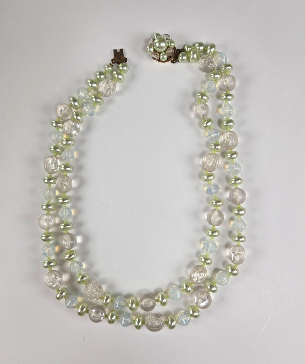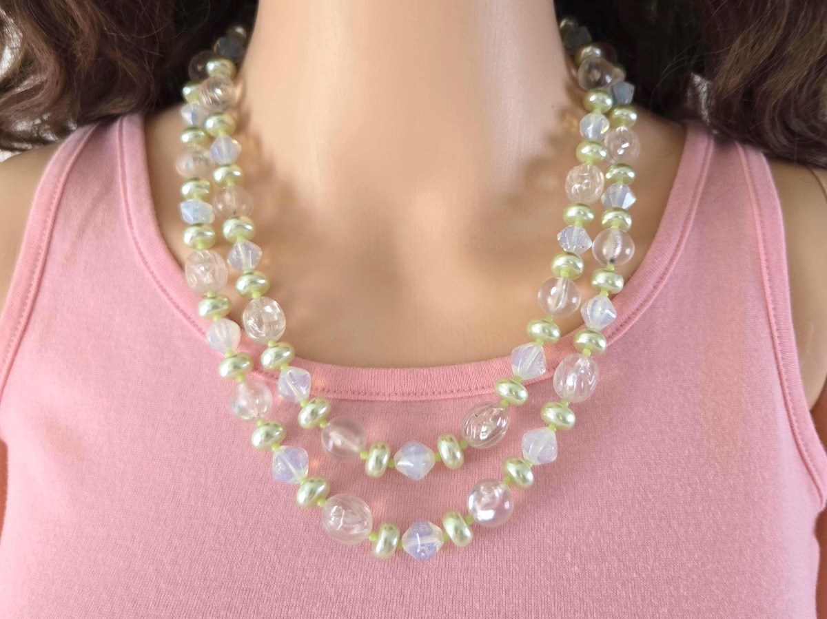 ?Style/Features: High quality dense beads in a perfectly colored vintage faux pearl beaded multi-strand necklace. The sophisticated layered design draped beautifully at the collarbone looks seamless with the hidden clasp. Both strands are comprised of an elegant mix of high quality lucite composite beads in opalescent rounds, pale mint faux pearls and slightly opaque unique clear crackle all strung tightly on silk. The soft luminous glow of the moonglow style lucite gives the piece a stunning, ethereal quality. Combined with the opal beads it exudes a very expensive look. Vintage like this was designed to appear to be very expensive fine jewelry while being affordable. This piece offers a refreshing pastel green pop of color, perfect for spring summer styling.