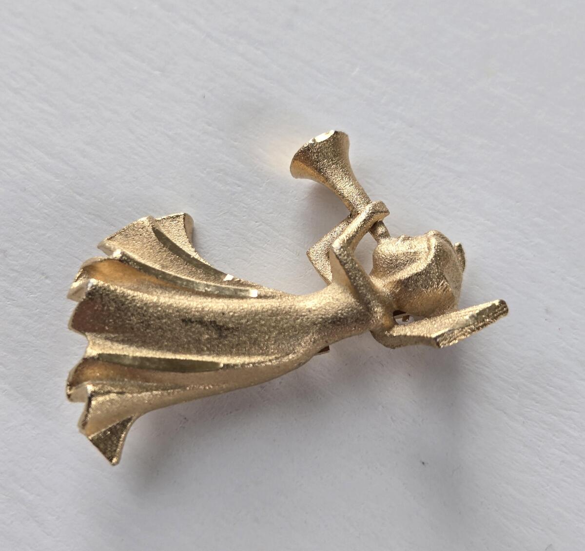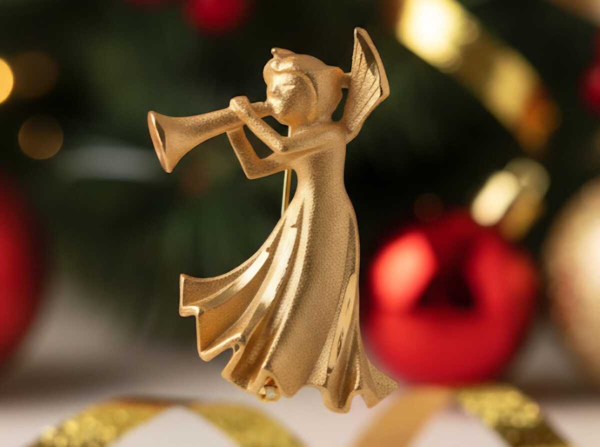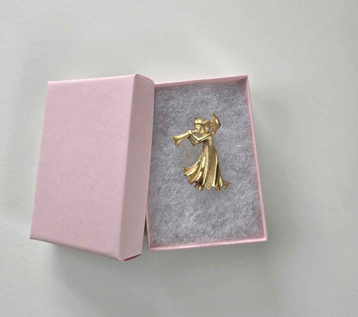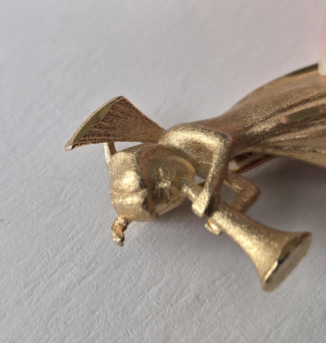 ?Style/Features: Bring a unique, joyful chime to your holiday with this charming gold herald angel pin. A truly standout piece it features brushed gold tone with shiny gold details. Just 1 inch tall this miniature vintage brooch is a perfectly detailed piece. What makes this angel special is the delightful pigtails! This whimsical touch gives the traditional trumpet-blowing angel a youthful one-of-a-kind character you won't find anywhere else. As a herald angel she symbolizes the joyful proclamation of the season, making her the perfect accessory. Tie up with ribbon and create an heirloom Christmas tree ornament to last a lifetime. Perfect size for lapels, coats, backpacks lanyards. Ships in a crisp pink box ready for red ribbon gifting.