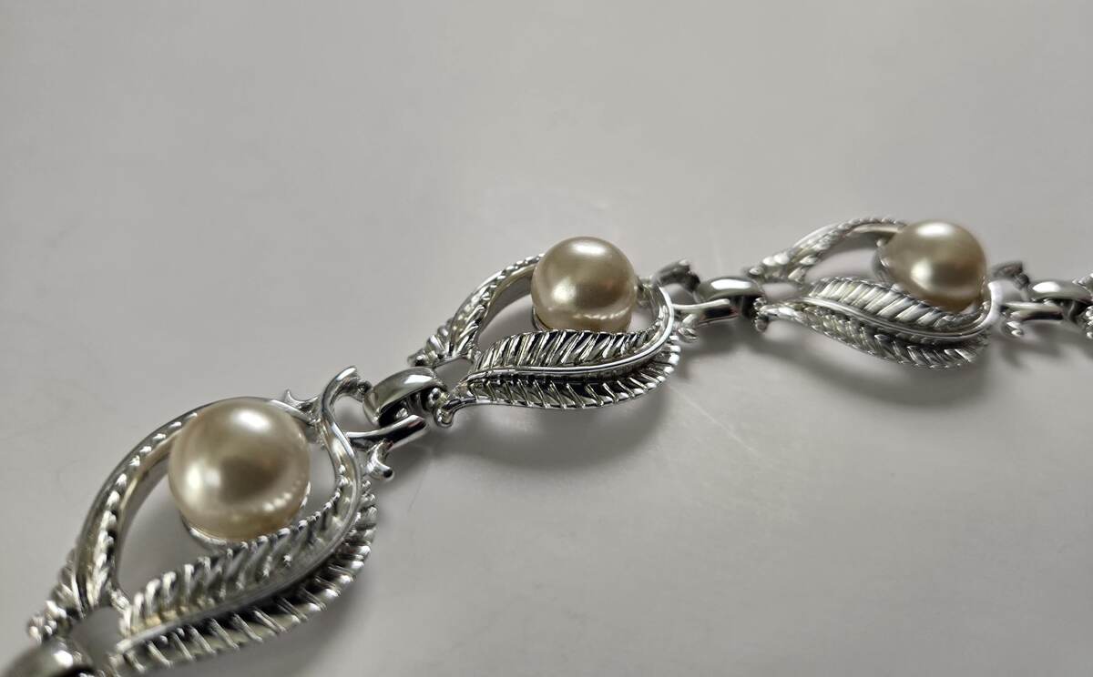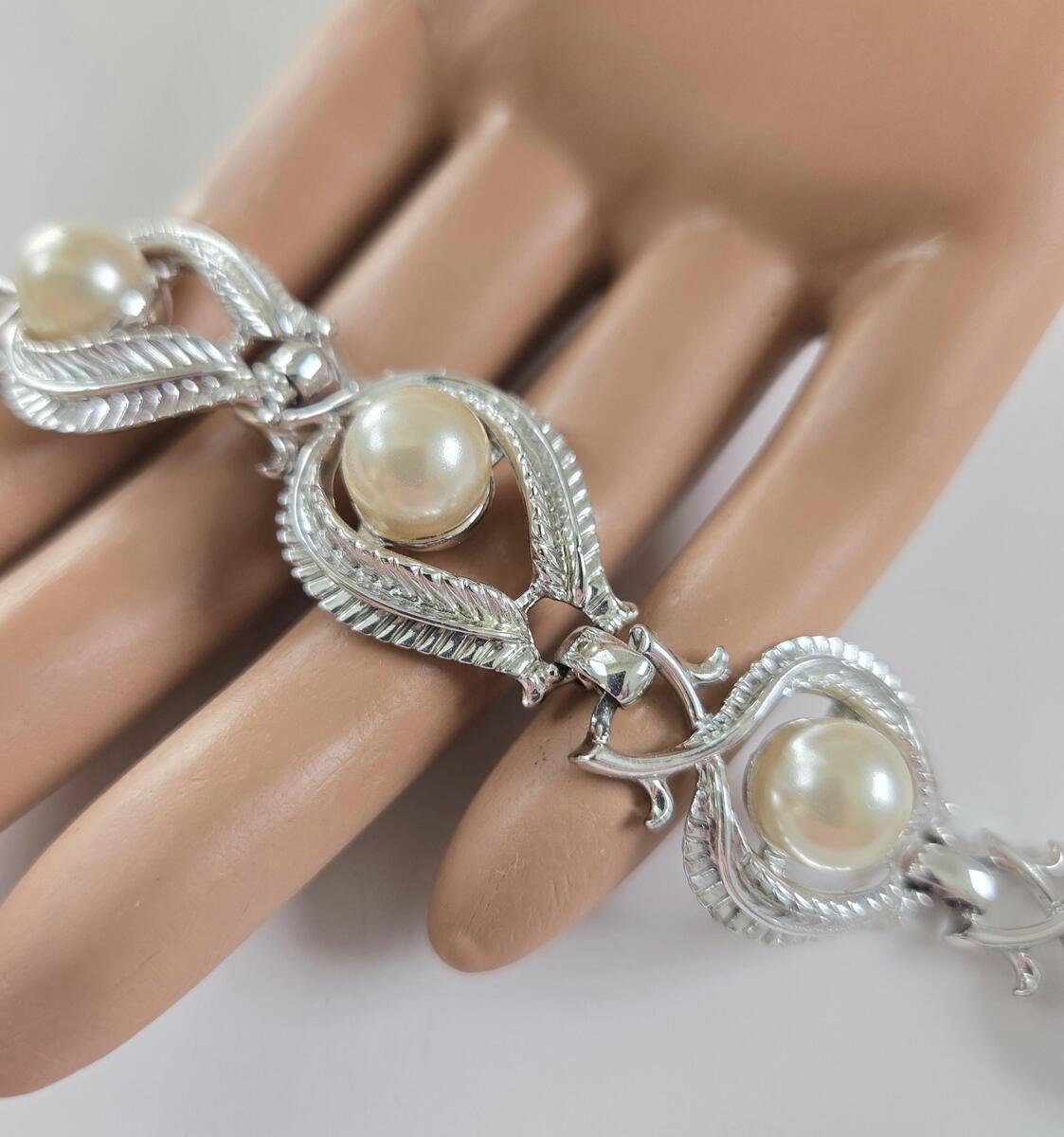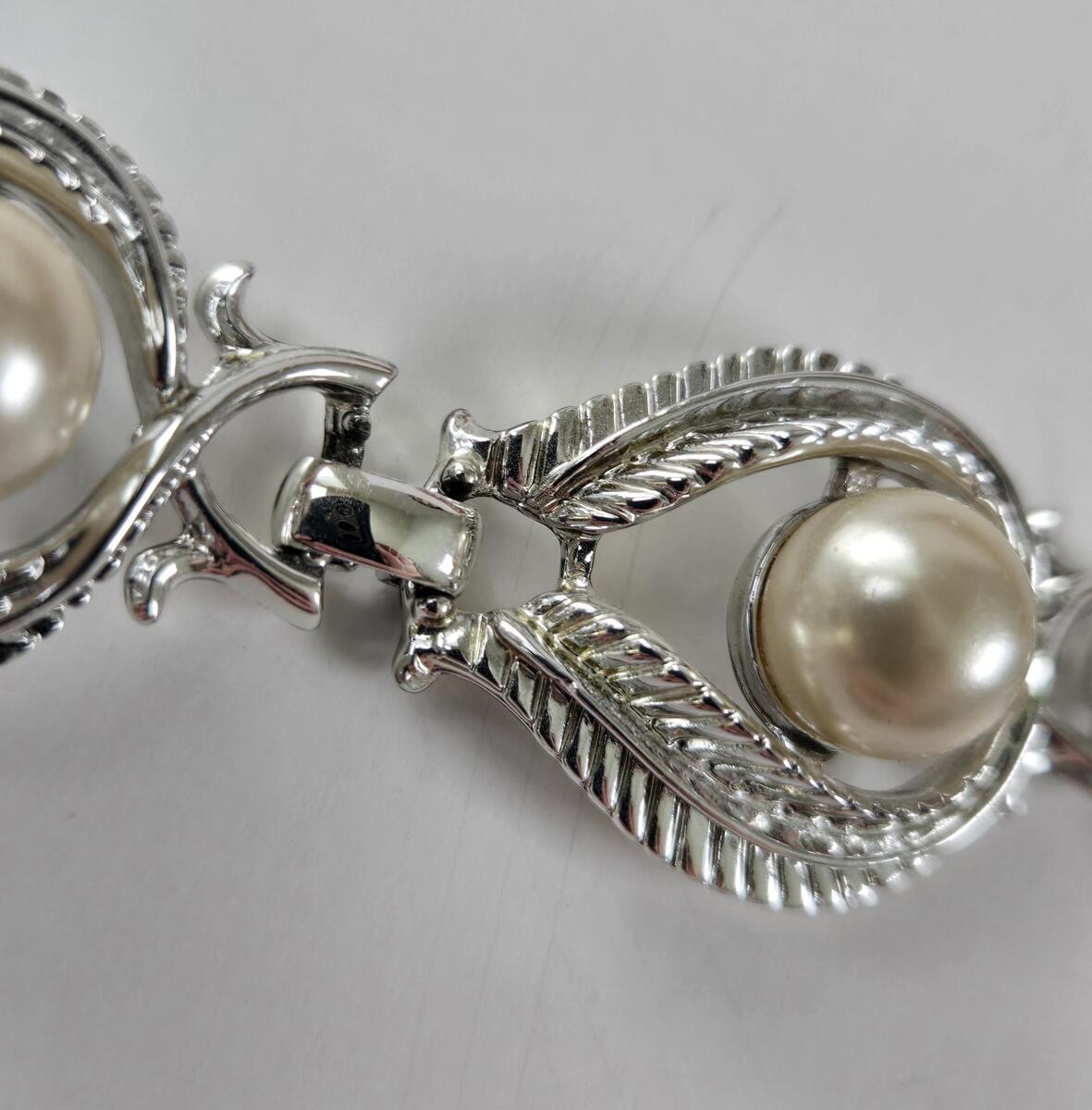 ?Style/Features: 1930s glamour with this rare Star Novelty Co signed pearl eye bracelet. A whimsical art deco treasure featuring rhodium plated links and faux pearls nestled in protective eye motifs. Size inclusive for larger wrists or effortless layering blending art deco charm with modern wearability. Appears to never been worn.