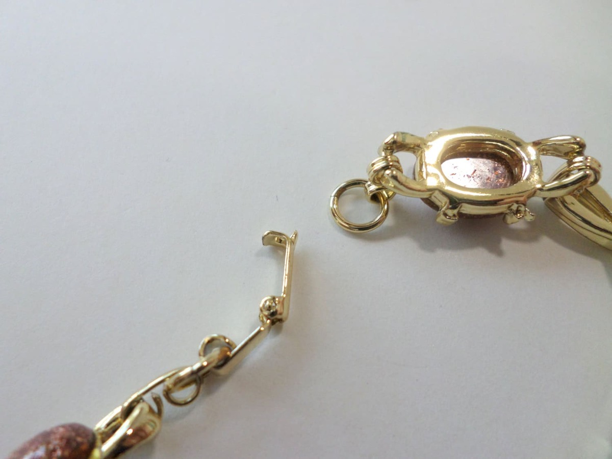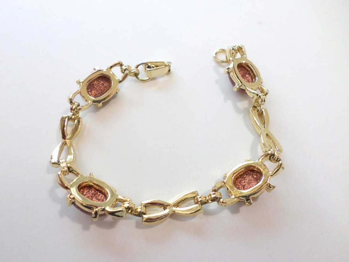 ?Style/Features: Reddish brown faux goldstone oval cabochons with gold flecks in an infinity gold tone plated bracelet is the perfect stacking and layering piece. A generous 8 inches with fold over snap clasp it will fit most everyone. Appears unworn.
