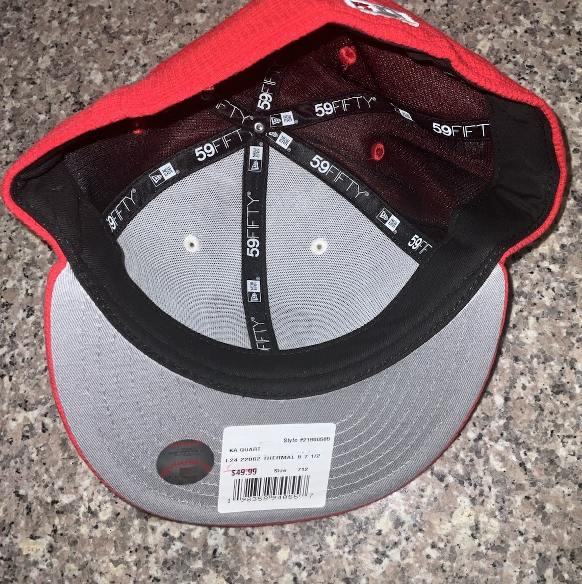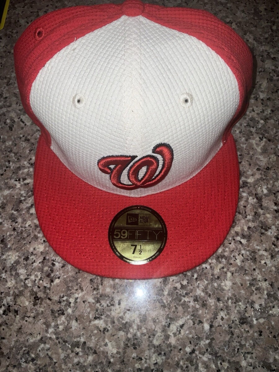 The Washington Nationals Hat is a red and white baseball cap in fitted size 7 1/2 from the brand New Era. This unisex adults hat features the team's colors and logo, making it a stylish accessory for fans of the Washington Nationals. Perfect for wearing to games or showing off team pride around town, this hat is a great addition to any baseball fan's collection.