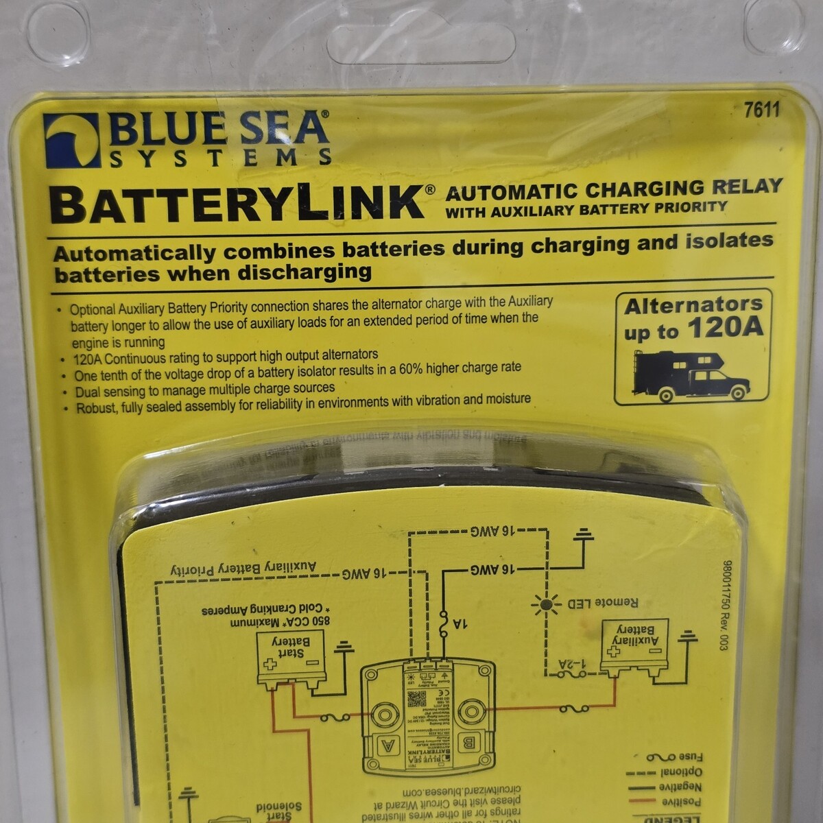 New in Package Blue Sea Systems Battery Link # 7611 Automatic Charging Relay with Auxiliary Battery Priority. Alternators up to 120A.