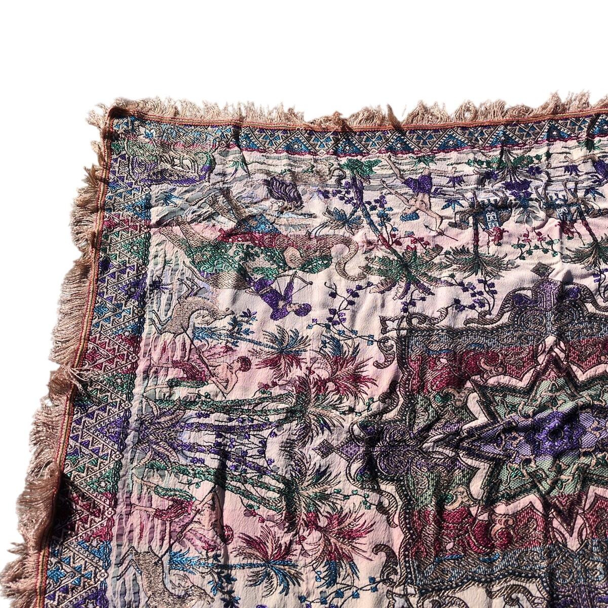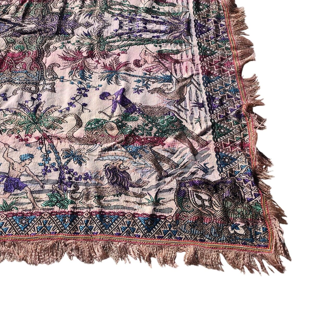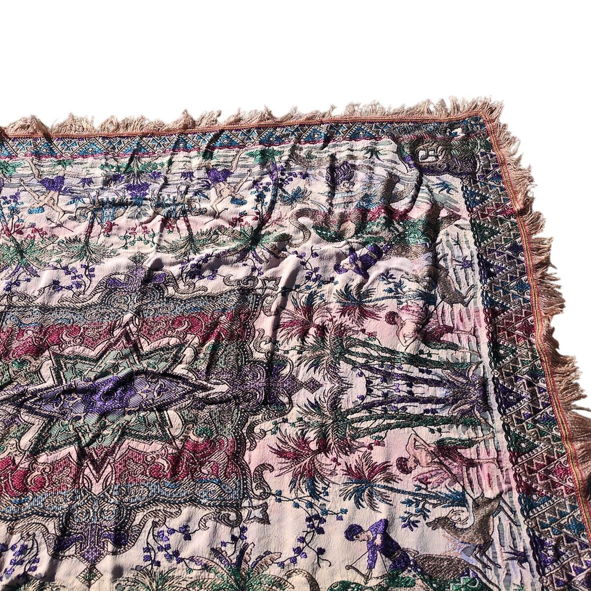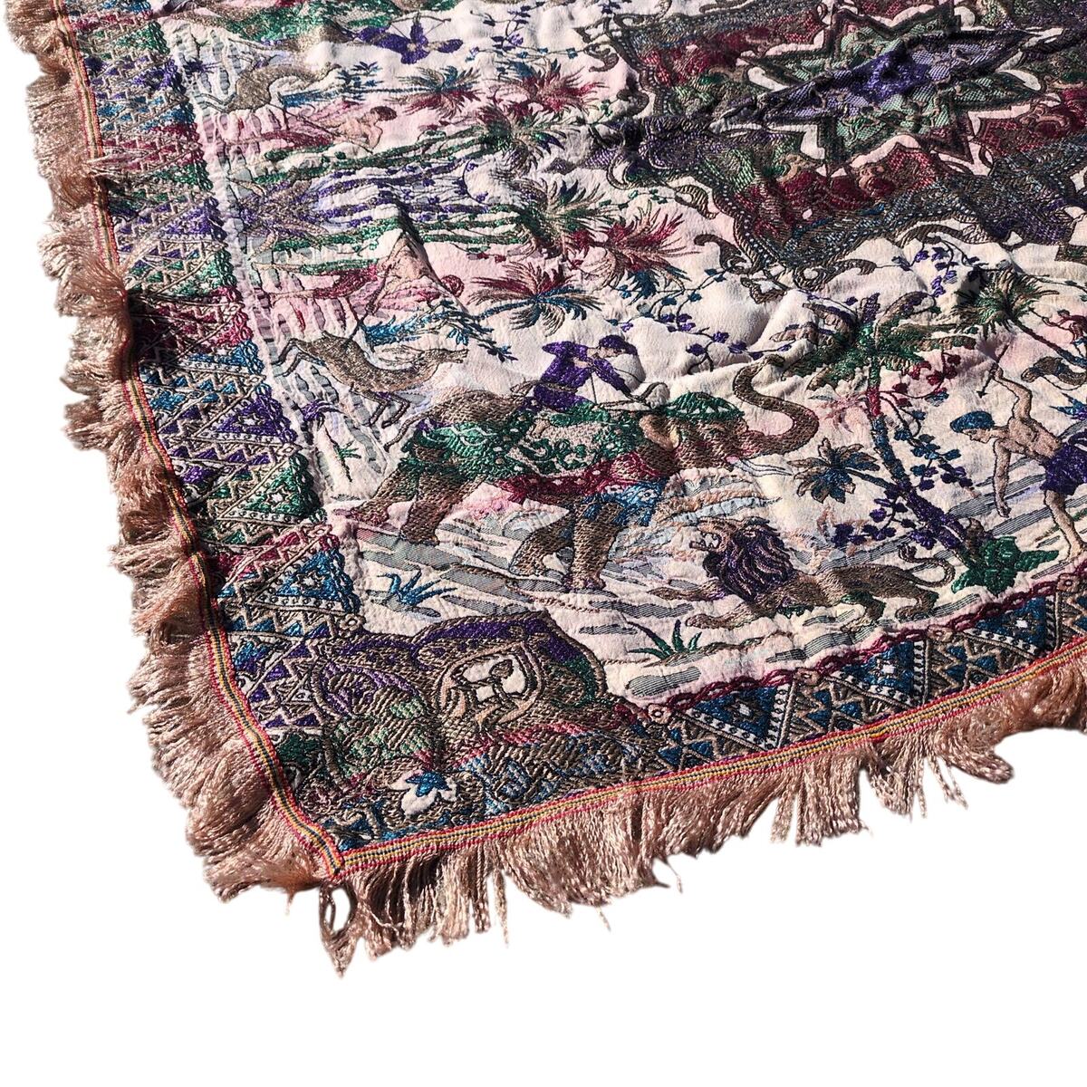 This traditional woven tapestry features South Asian/Indian motifs including Elephants, palm trees, camels, lions, men in turbans, 8-pointed centered star and more. It has a flatweave jacquard style, probably with a silk or viscose blend to give it some sheen. The entire piece has a fringed edge. The colors are quite bold with a beige base with purple, red blue and green colors. It measures about 43x53 inches.