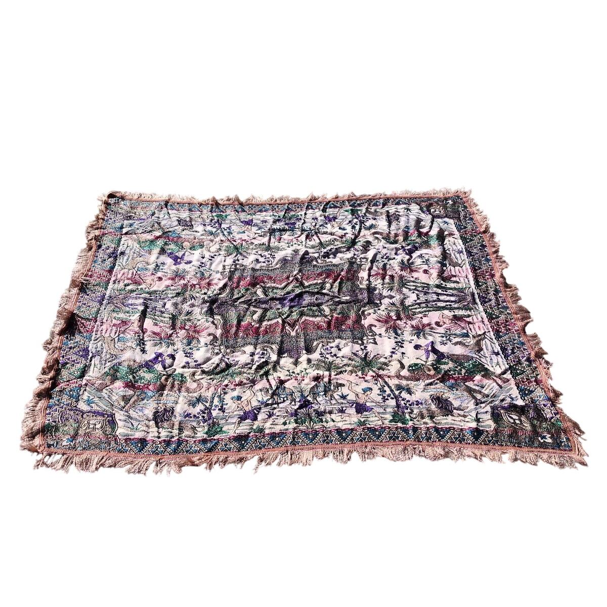 Vtg Indian 43x53" Woven Tapestry Wall Hanging or Blanket Elephants Camels Lions