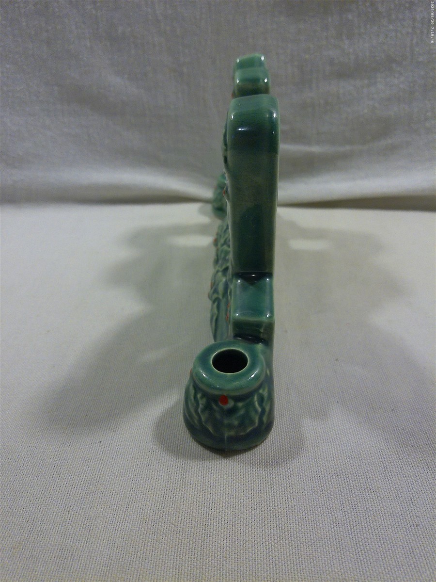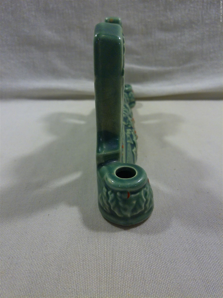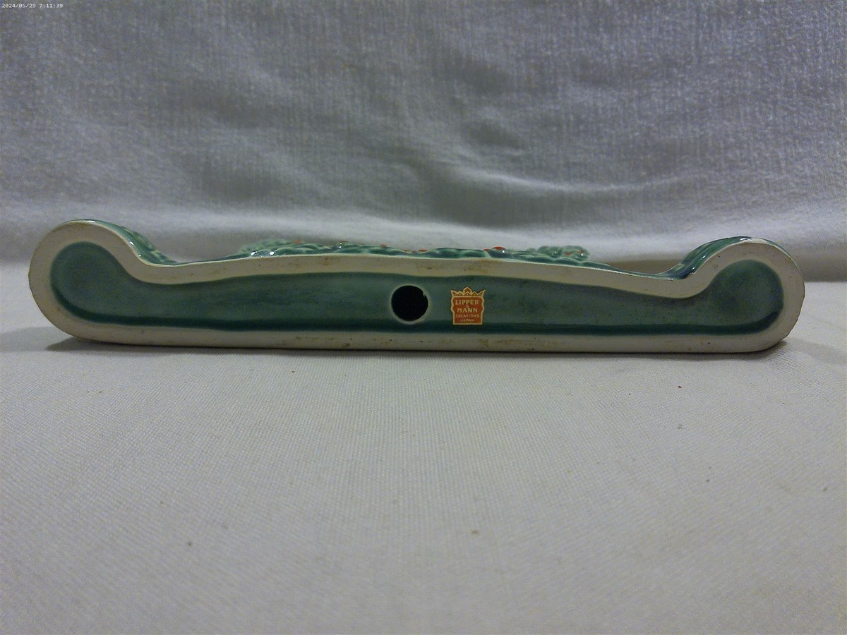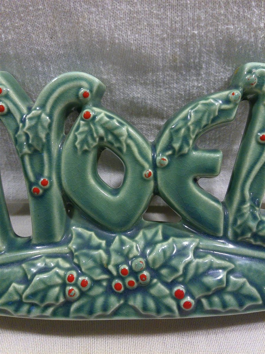 This is a vintage Lipper Mann Japan Ceramic Christmas Green NOEL Holly Berry Candle holder. The candle holder has raised red holly berries. The original red and gold foil Lipper Mann Creations Japan label is attached to the bottom of the candle holder. The candle holder measures approximately 5 1/4" tall and 11" wide. Nice clean Lipper Mann Japan ceramic green NOEL holly berry candle holder that displays absolutely great when sitting on a shelf!