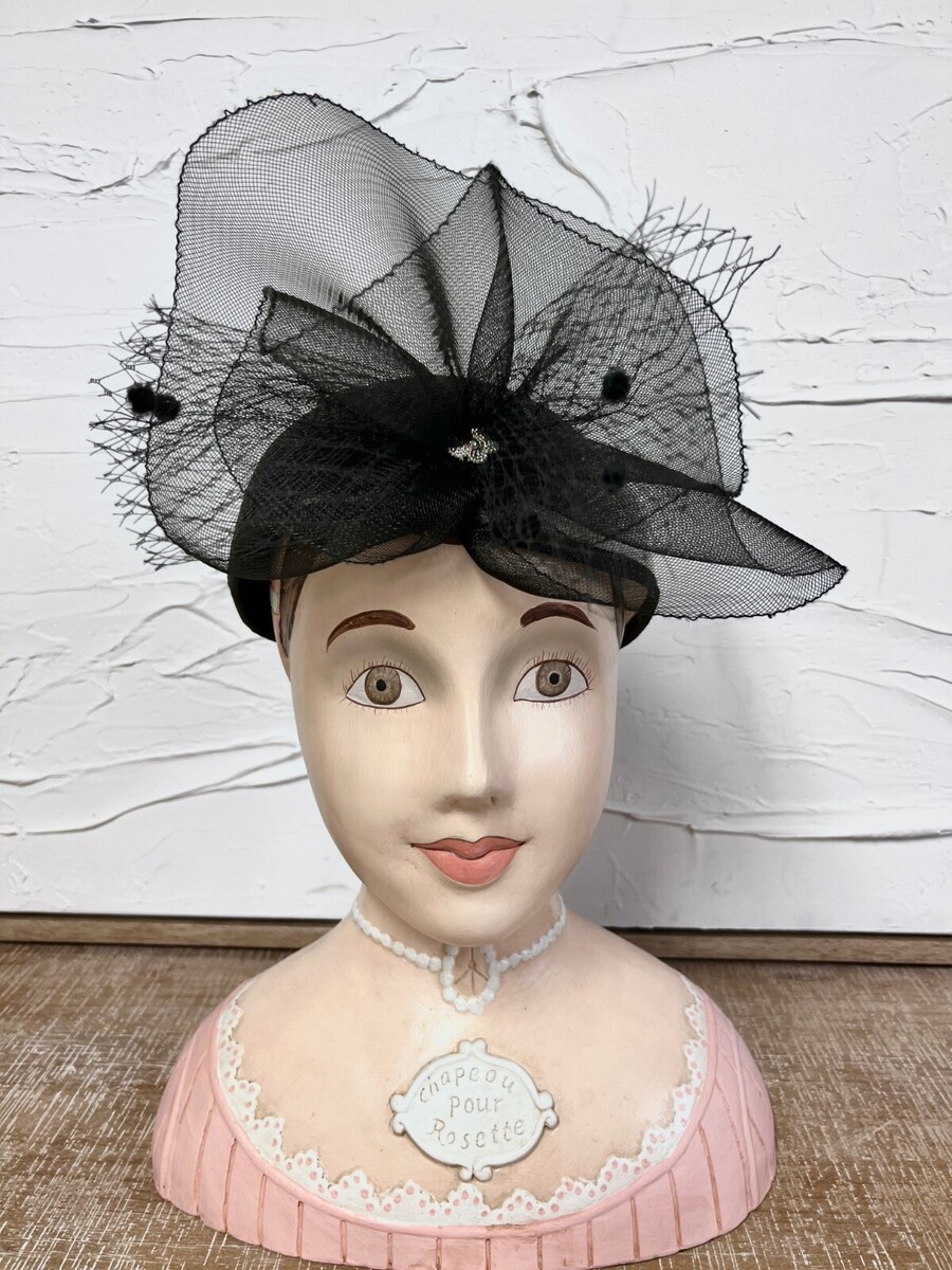 Reads on the front " Chapeau Pour Rosette" Stands 13 inches high, head circumference of 19 1/2 " Base is 10 3/4 x 6 " Not certain of the material, maybe plaster / plastic, painted 3 dimensional features with a choker necklace, lace edging on collar, In excellent condition, no flaws, scratches or otherwise.