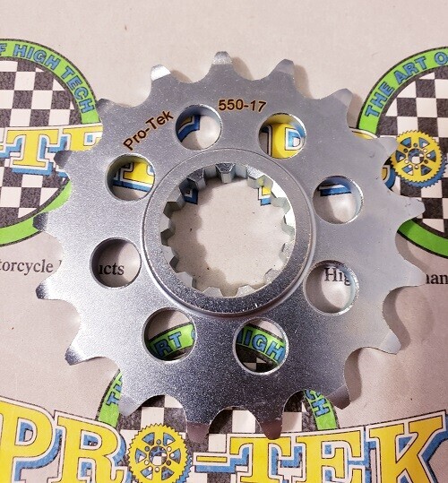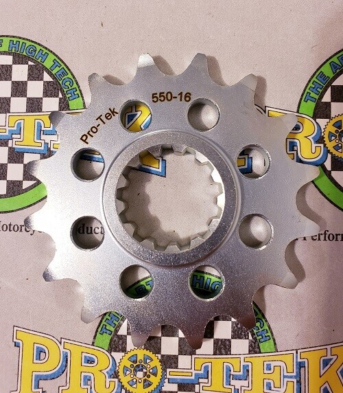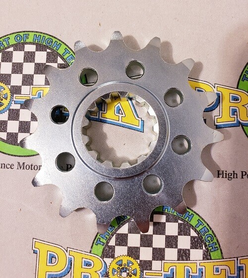 Pro-tek front sprockets are completely CNC machined to exact tolerances from 4140 nickel-chromoly steel resulting in a quality product. None of the Pro-tek front sprockets are gear hobbed, but are lightened with drilled holes to save on rotating mass. Every lb of rotating mass equates to a 4 lb weight reduction. The sprockets are then case hardened to Rc 58-60 and finished with a zinc plating for added durability and protection from corrosion. Made in the USA, normally retail for $29.95. This is for a 520 Pitch front sprocket 14, 15, 16 or 17 tooth.