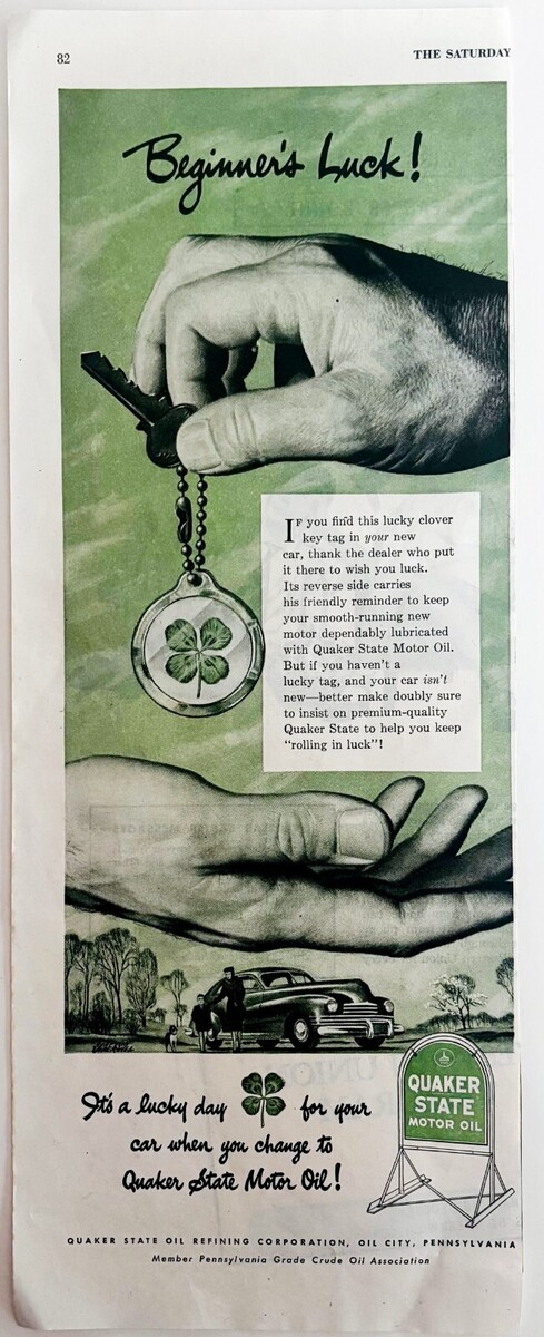 1947 Quaker State Motor Oil Advertisement Gasoline & Oil Lucky Clover DWJJ21