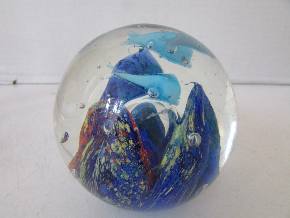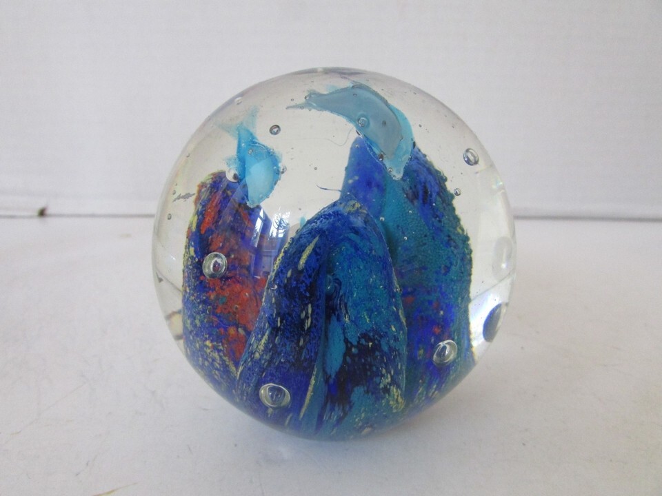 GLASS PAPERWEIGHT DOLPHINS AMIDST ROCK FORMATIONS CONTROLLED BUBBLE 3.25"H