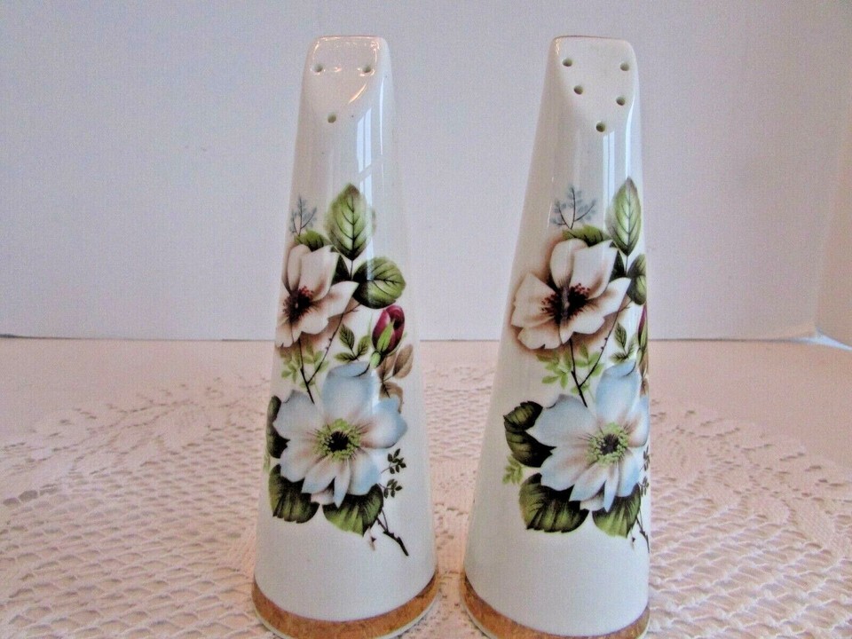 VTG SANDFORD BONE CHINA SALT & PEPPER SHAKERS FLORALS W/GOLD TRIM 5.75" ENGLAND