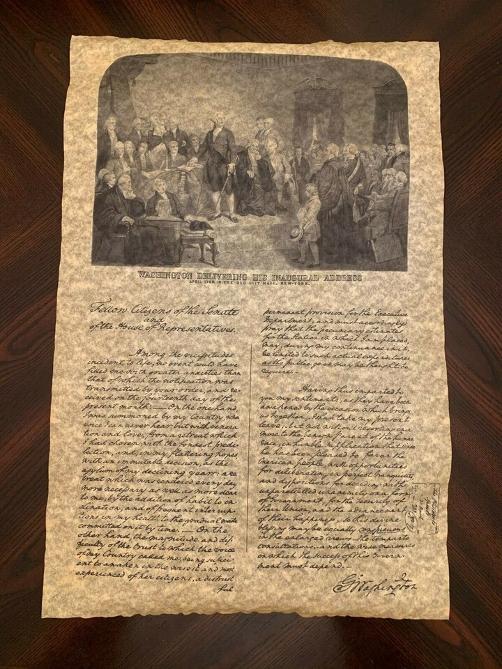 This is a George Washington Inaugural Address Parchment replica in tube, perfect for collectors and enthusiasts of historical memorabilia. The parchment is a replica with an image and is rolled up in a tube for safekeeping. The address was given by George Washington, the first president of the United States.. This item is a must-have for any fan of American history and political figures.