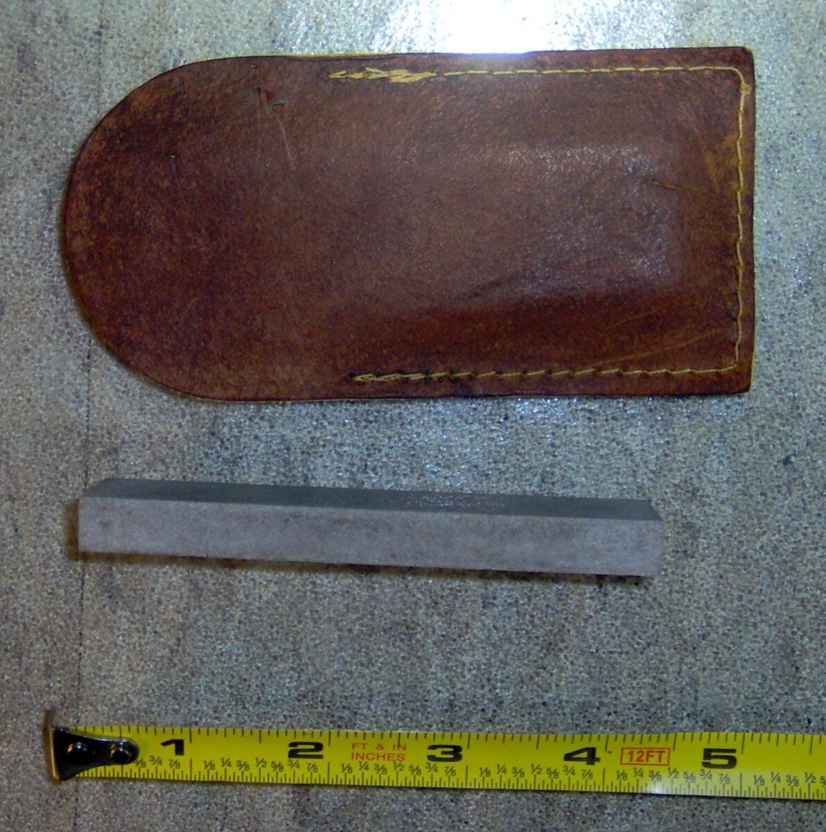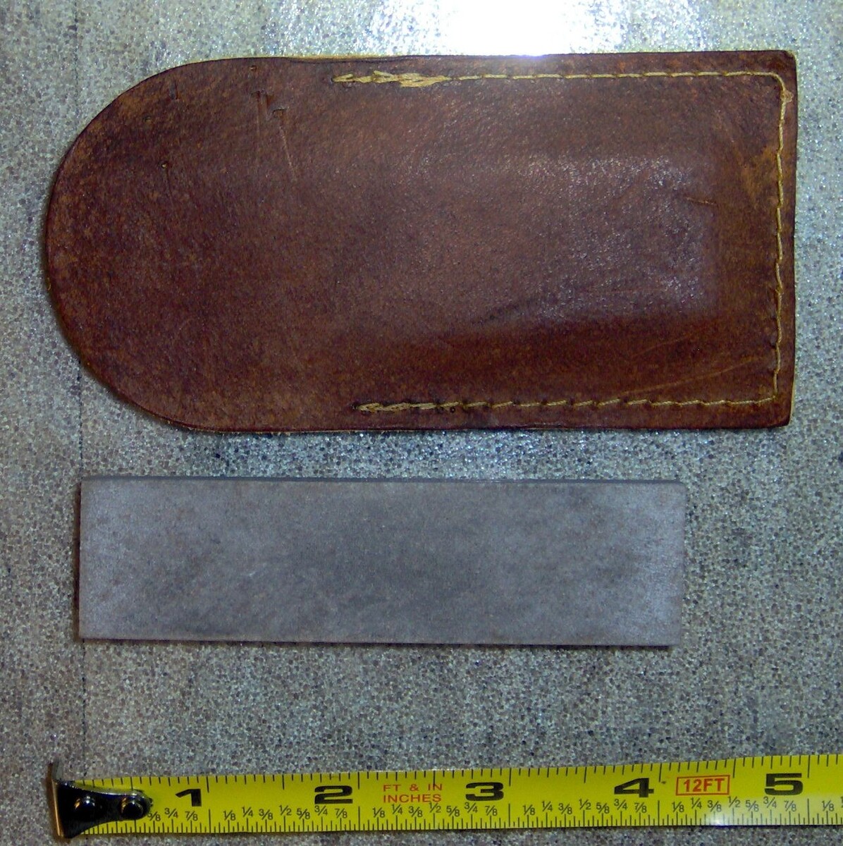 (1) USED SMITH'S 4" POCKET KNIFE PAL SHARPENING STONE AND LEATHER SHEATH (case) MANUFACTURED BY SMITH'S. THIS USED STONE AND CASE WAS SOLD 30+ YEARS AGO AS SMITH'S POCKET KNIFE PAL. THIS SALE INCLUDES THE ORIGINAL SMITH'S SHARPENING STONE SHOWING SIGNS OF USE, IN GREAT CONDITION, ALSO THE LEATHER SMITH'S CASE WITH FRONT STAMPED IMPRINT... "SMITH'S THE SYMBOL OF SHARPENING". YOU WILL RECEIVE ONE (1) USED SMITH'S STONE AND LEATHER CASE, AS PICTURED, SHIPPED BY USPS....