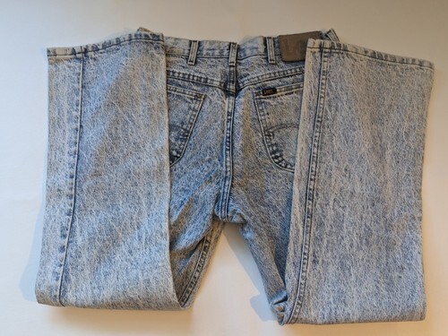 A la venta hay un par de jeans de mezclilla Lee Acid Wash vintage de 1980 usados ??y no abusados, 33x30 Union Made Cotton USA.