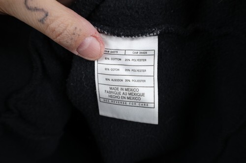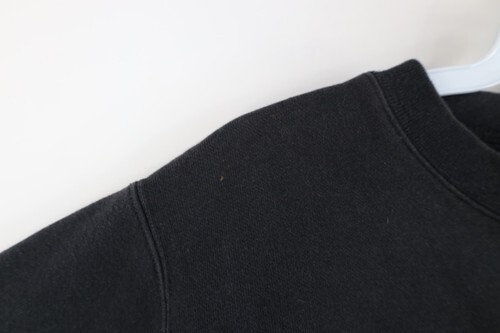 Blemishes, sun faded/discolored throughout. Holes front top left. Elastic threads poking out of cuffs. Graphics cracking/faded, color faded. Collar, cuffs discolored. Pilling