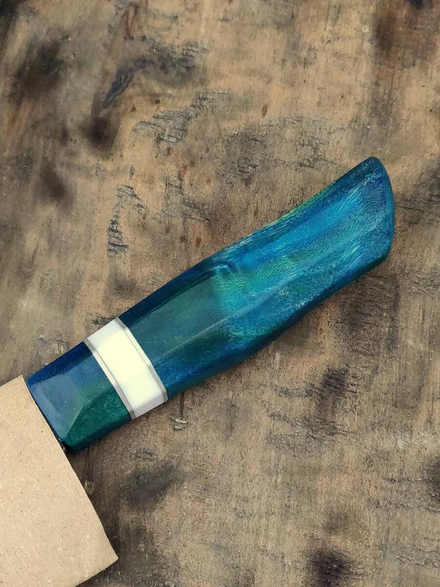 The handle is multi color-stabilized spalted birch, stabilized by me. The spacer is stainless steel. It's octagonally shaped. The finish is a mat (mixture of oils and waxes)