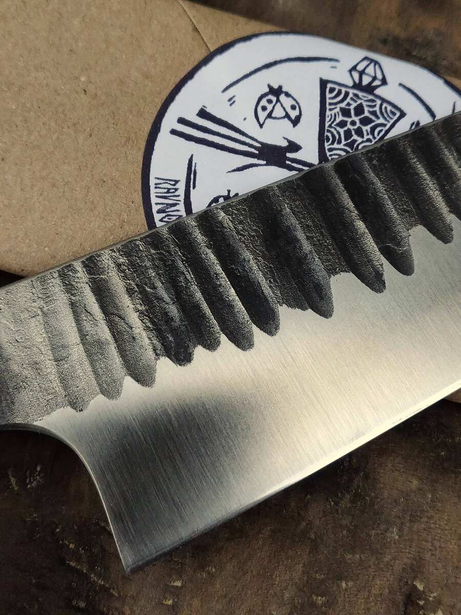 Spine tapers from 3mm at heal to 2mm spine at the middle, 1,4mm just before the bevel starts on the tip. The thin grind means it will cut most of the veggies and meat super easily (won't wedge), but should not do deboning, cutting through bones or harder shells, different grind should be done for that. It feels like a laser cutting through stuff with almost no resistance.