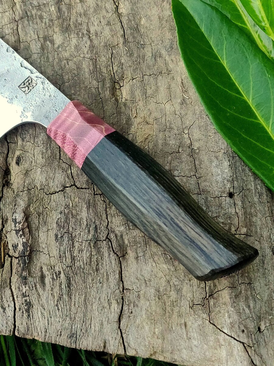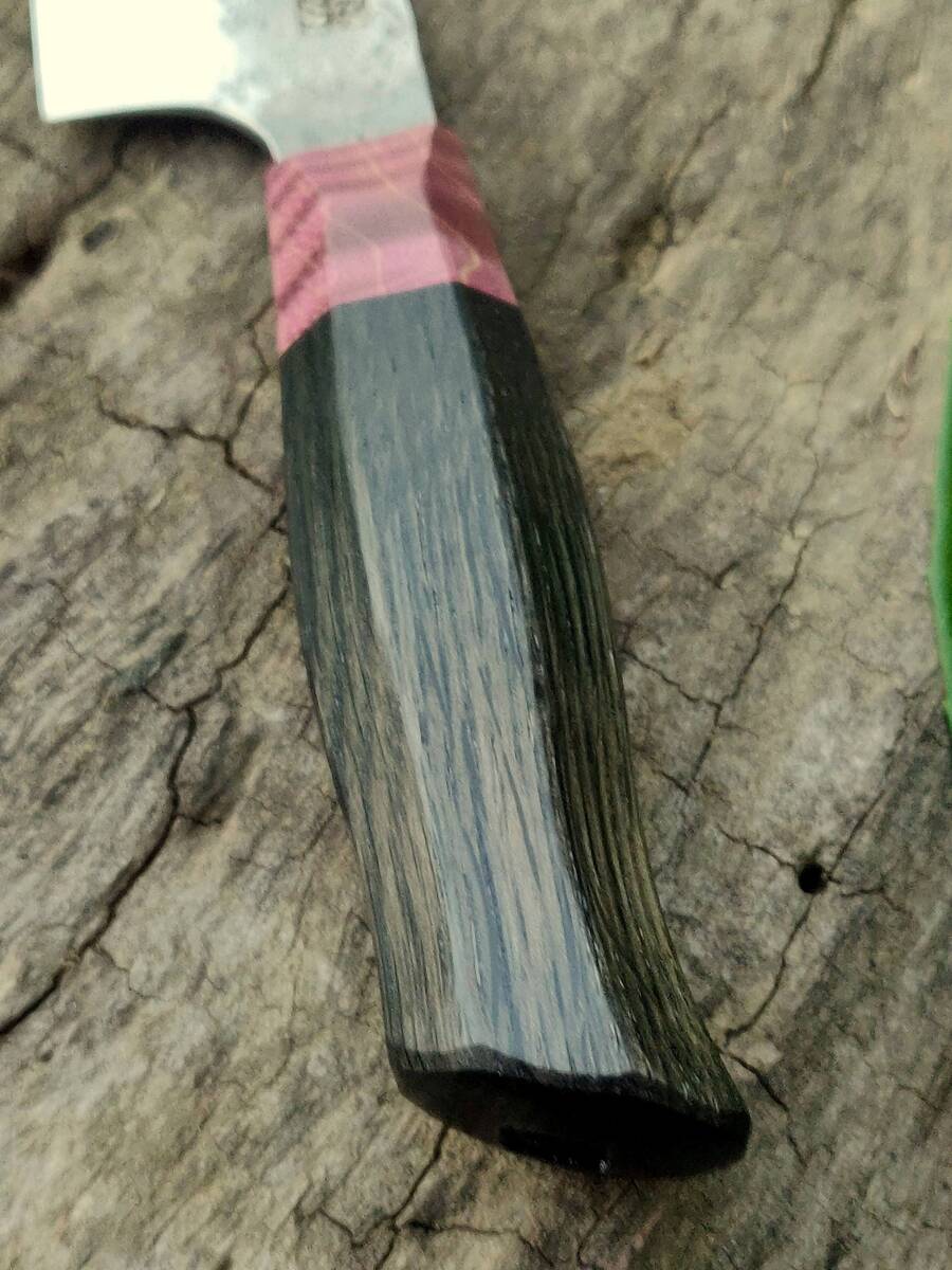 Handle is bog oak, stabilized by me. The spacer is purple curly maple. It's octagonally shaped.
