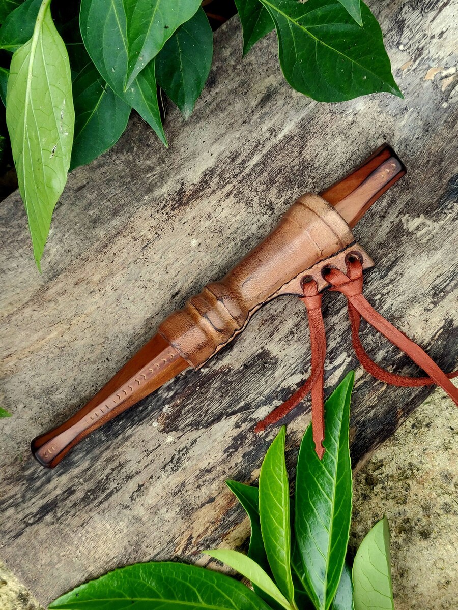 The knife and the wooden part of the sheath are decorated with small crescent moon carvings. The leather part is intentionally rubbed with fine charcoal dust to make it look used.