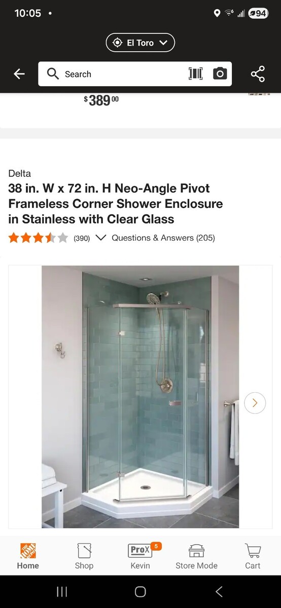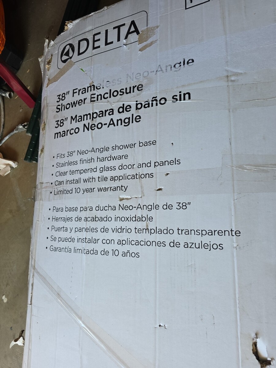 38 inch frameless neo angle shower enclosure stainless steel clear.... Shipped with USPS Ground Advantage.