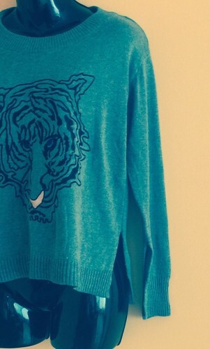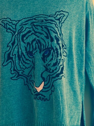 This sweater is in excellent used condition with no signs of damage of any kind. It features a crew neck, long sleeves with slides on the sides and a tiger intarsia detail in the front. Size Small. Made in Turkey.