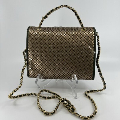 The VTNG Whiting Davis Green Gold Bronze Copper Handle Chain Shoulder Crossbody bag is a stylish and versatile accessory for women. The small size and snap closure make it convenient for on-the-go use, while the gold and green exterior and gold hardware add a touch of elegance. The mesh and metal exterior, along with the copper hardware, give it a unique and fashionable look. This crossbody or shoulder bag is perfect for adding a pop of color to your outfit and making a statement.