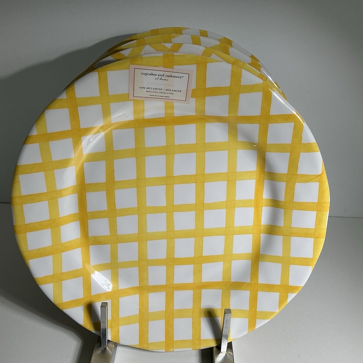 MELAMINE White & Yellow White Plaid 11" Dinner Plates Set 4 New