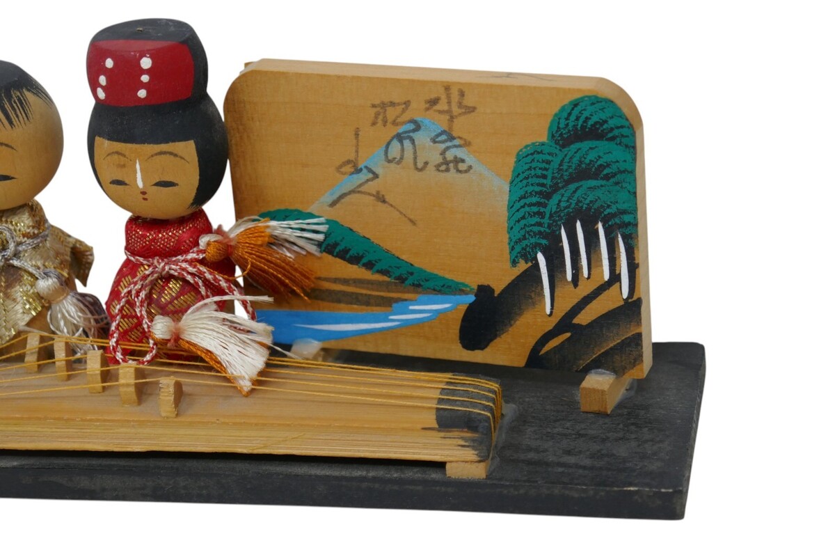 Japanese Kokeshi Doll Couple with Koto and Painted Backdrop – Handcrafted Wooden