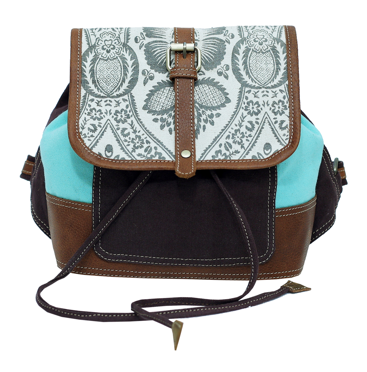 Challenger backpack made from lightweight turquoise upholstery canvas and accented with a floral printed pattern. The chestnut leather accents beautifully complete the look. Features antique brass hardware, button with drawstring closure to secure items, and adjustable shoulder straps. Fully lined interior features 2 open side compartments and 1 zippered side pocket for storing smaller items. Bag measures 10" long x 4" wide x 10" tall.