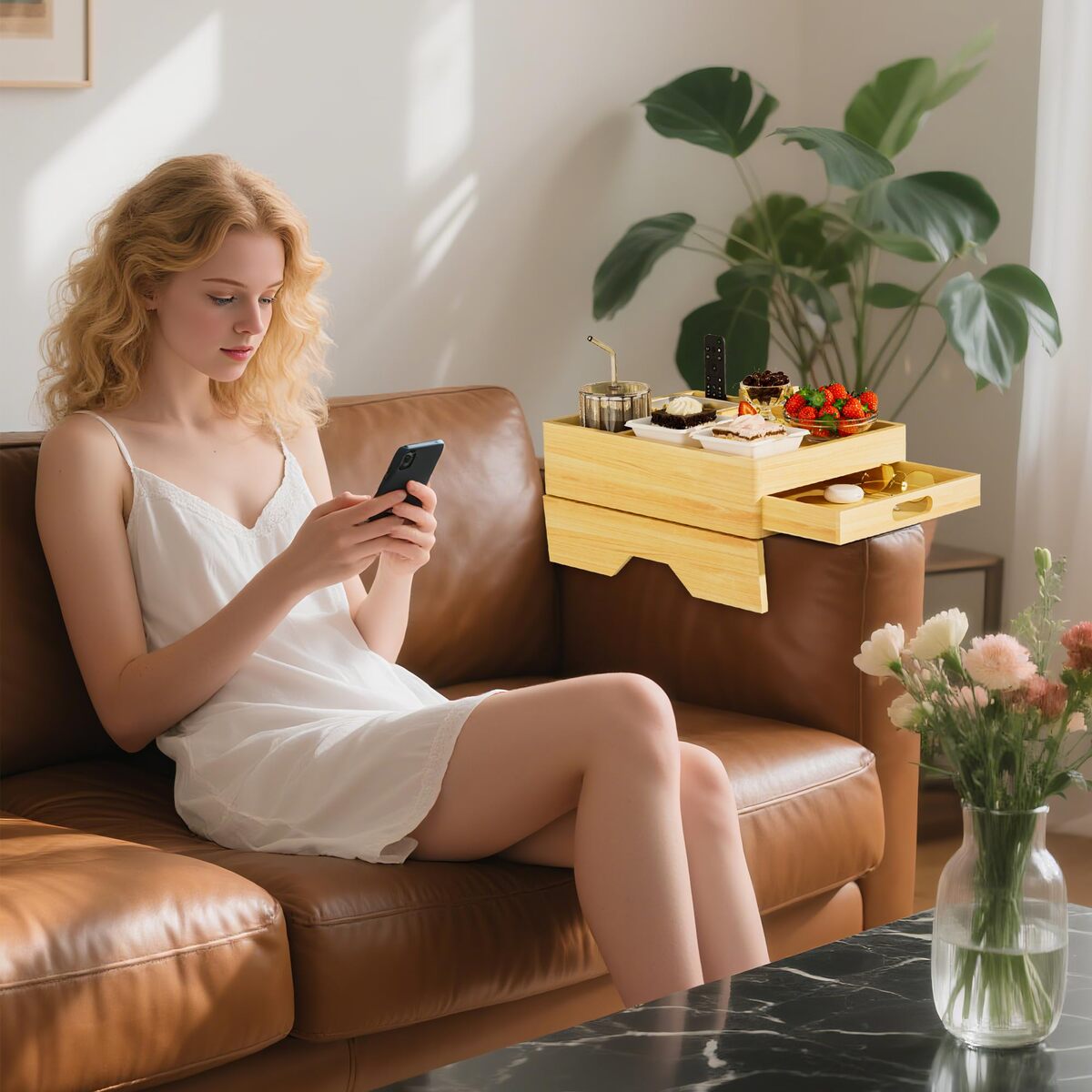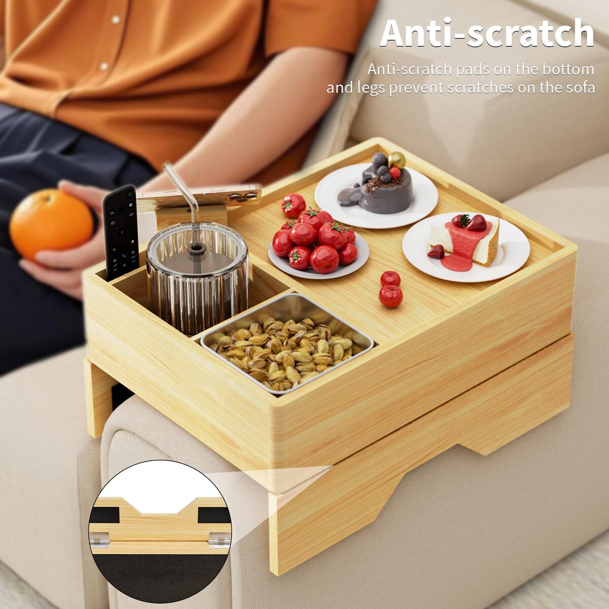 ?Non-slip Couch Arm Tray?The spring armrest provides enough tension to hold couch cup holder firmly on the sofa armrests. The non-slip pads on the back of the couch table and the legs can ensure the stability of the tray, prevent drinks from spilling and dirtying the sofa, and protect the sofa from damage.
