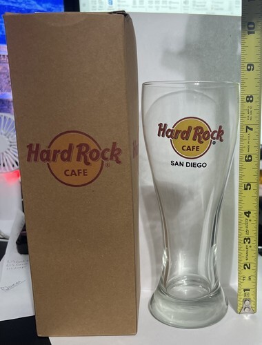 This Hard Rock Cafe Pilsner Style Beer Glass is a must-have for any fan of rock and pop music. The glass is adorned with the iconic Hard Rock Cafe logo from San Diego and is perfect for enjoying your favorite beverage. It is ideal for use at home or as a gift for a fellow music enthusiast.