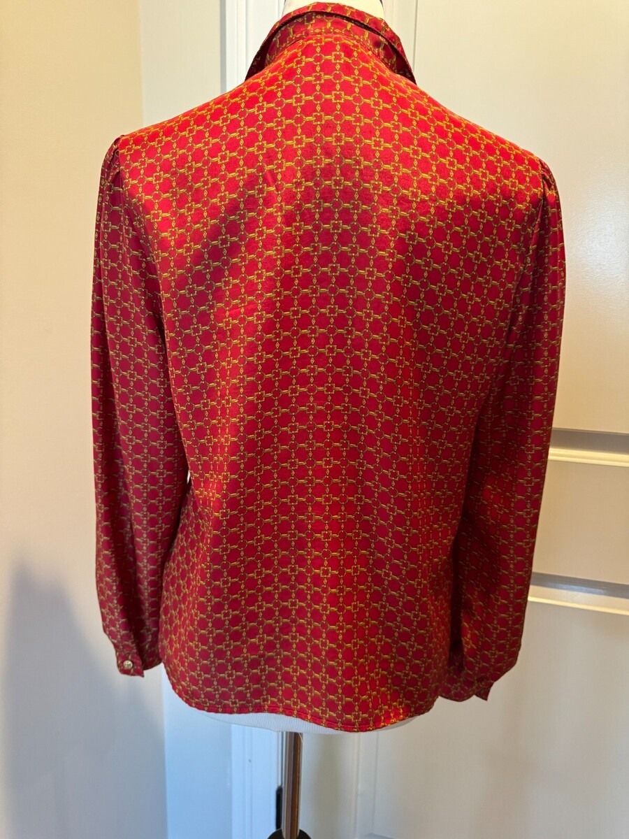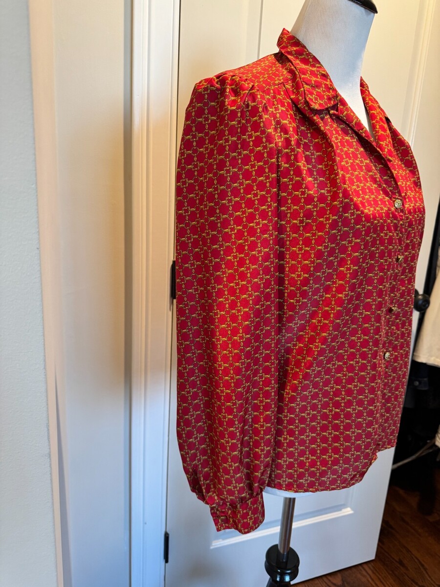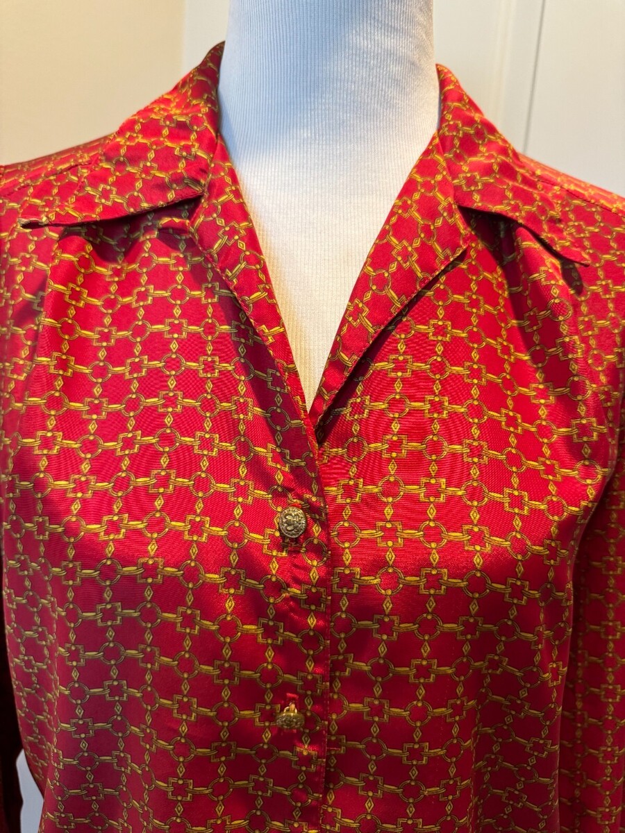 This pre-owned Gianna red blouse with yellow chain link pattern is in excellent pre-owned condition with no signs of damage of any kind. this shirt features:
