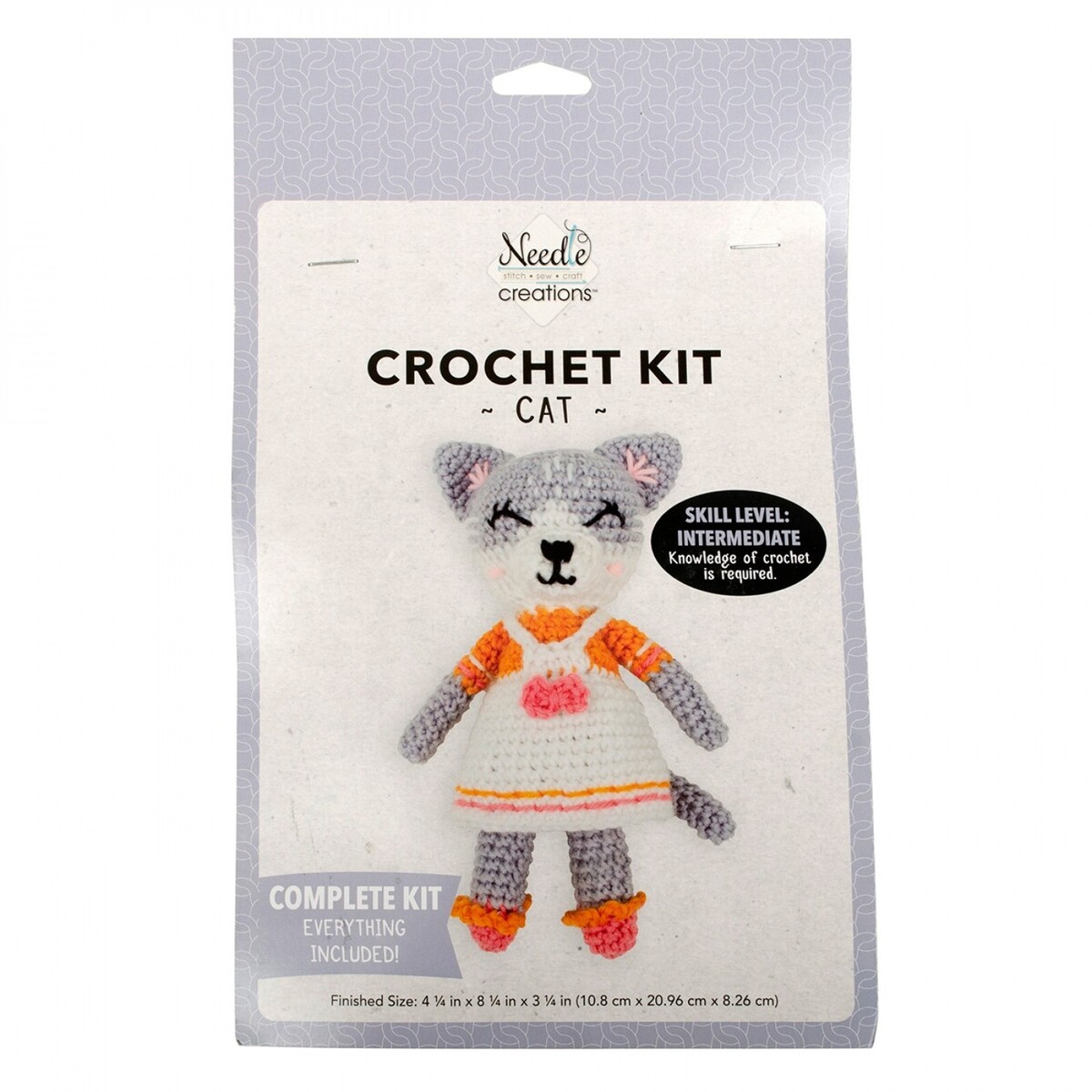 Needle Creations Pink Cat Crochet Kit. Complete Kit Everything Included. Materials Included: 100 Percent Polyester Yarn, 100 Percent Polyester Fiberfill, Plastic Crochet Hook. Plastic Needle, and Instructions. Skill Level Intermediate. Finished Size: 4-1/4 inches x 8-1/4 inches x 3-1/4 inches. CHK-NC-CRCHKT-CAT2