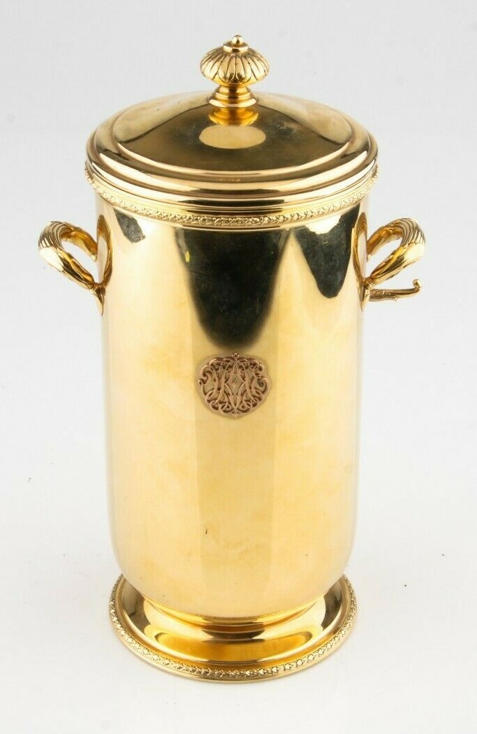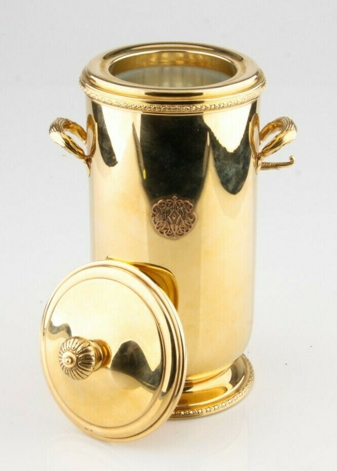 Questo contenitore termico da parte del Maison Cartier e realizzato in oro a 14 carati. Il corpo sottile e cilindrico viene sollevato su un bordo rotondo, adornato con un fregio floreale raffinato e girevole. Quest'ultimo si ripete lungo il bordo superiore. La copertura e incoronata con una finia floreale e ci sono piccole maniglie di acanthus sui lati. La parte anteriore e decorata con un monogramma intrecciato in rilievo. A causa dell'isolamento, il contenitore puo essere usato come secchio di ghiaccio squisito.