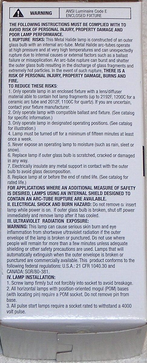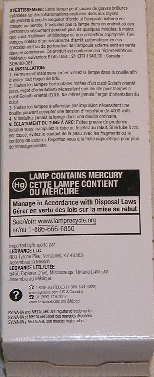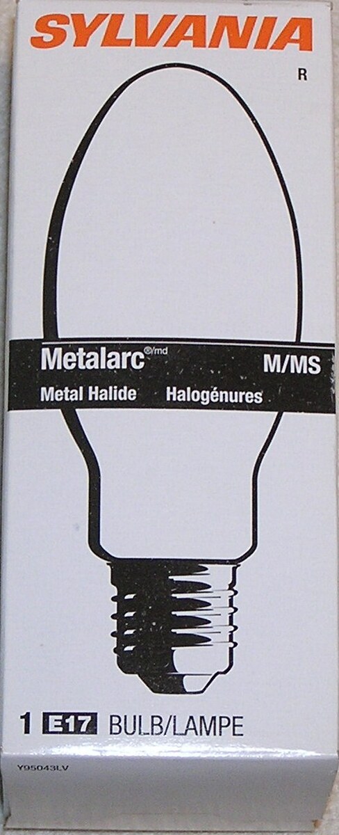 This listing is for a Sylvania Metalarc 64479, 175 Watt Medium Base Metal Halide Lamp. It is rated at 10,000 hours life. It was manufactured in Mexico.