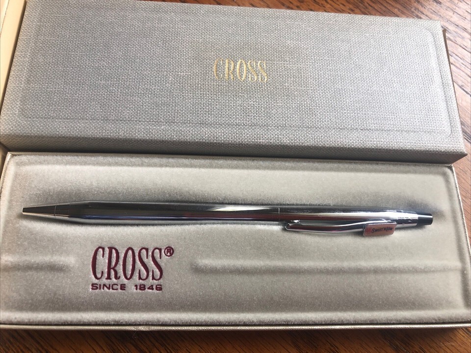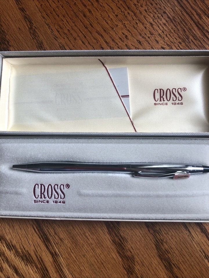 The Cross Pen Model 3502 is a vintage ballpoint pen made of metal with a sleek chrome trim. It features a black ink color and is not personalized. This collectible pen from Cross is a classic and stylish writing instrument that is perfect for everyday use or adding to a pen collection. The new open box may have some box damage, but the pen itself is in excellent condition and ready to write beautifully.