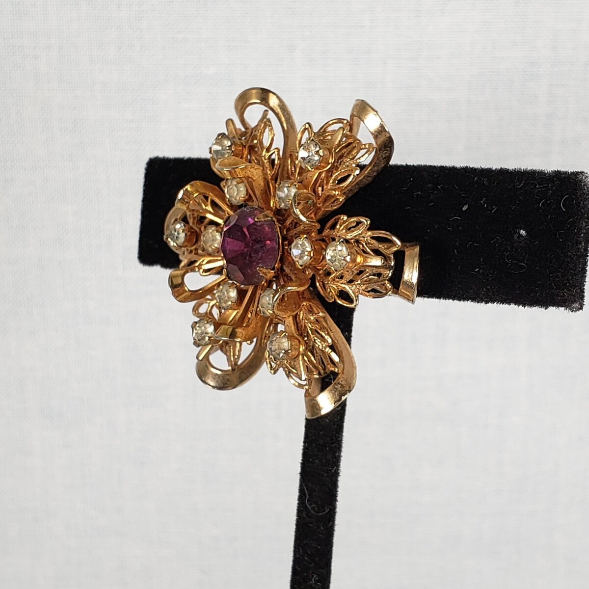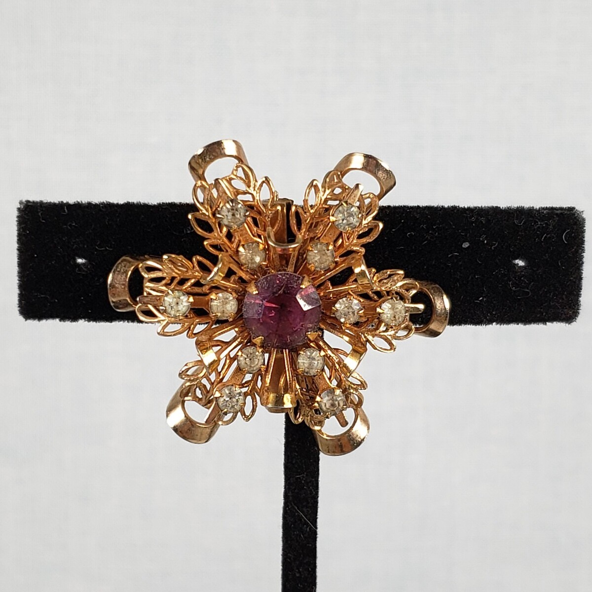 Vintage Gold Tone Purple Clear Crystal Rhinestone Floral Filigree Leaf Starburst Brooch