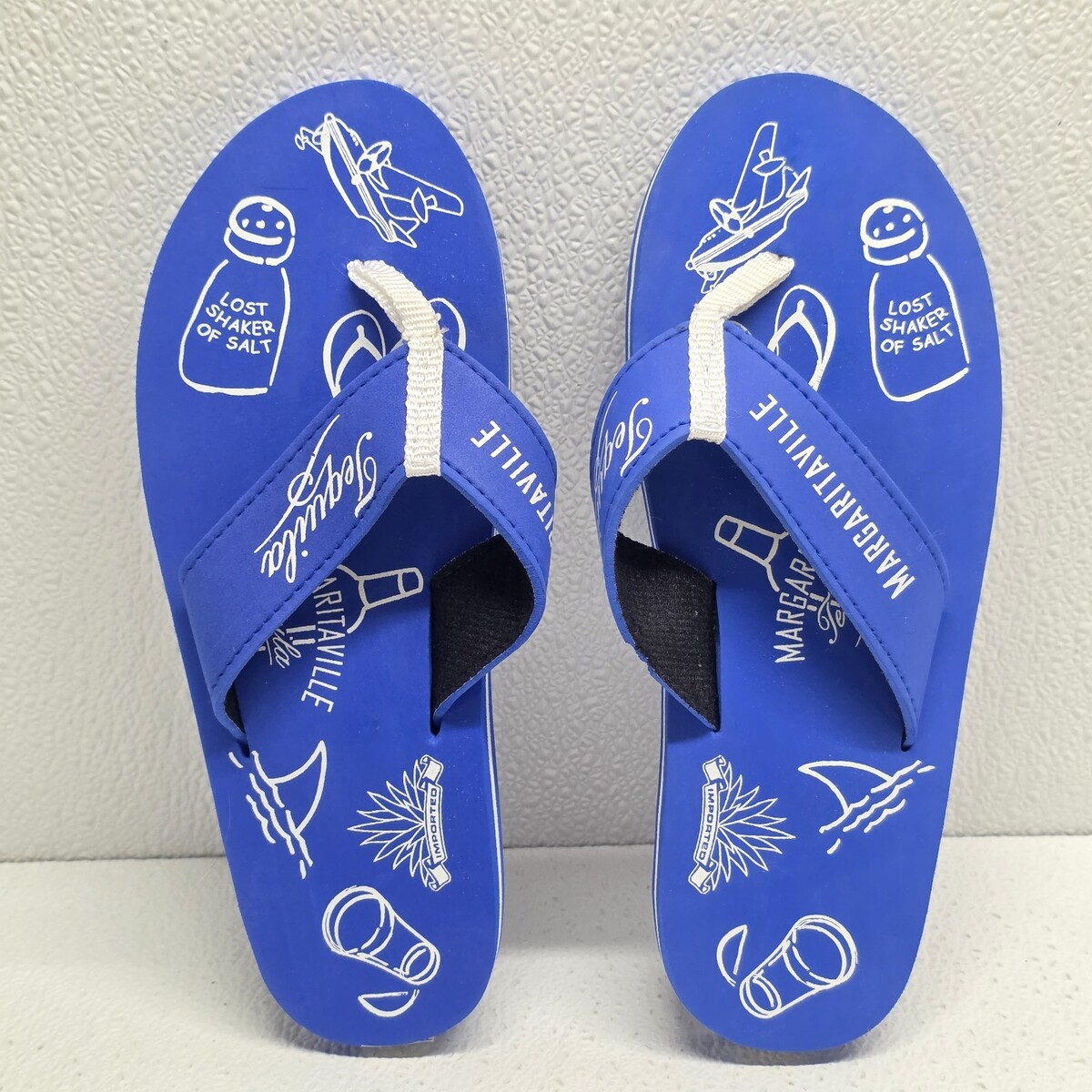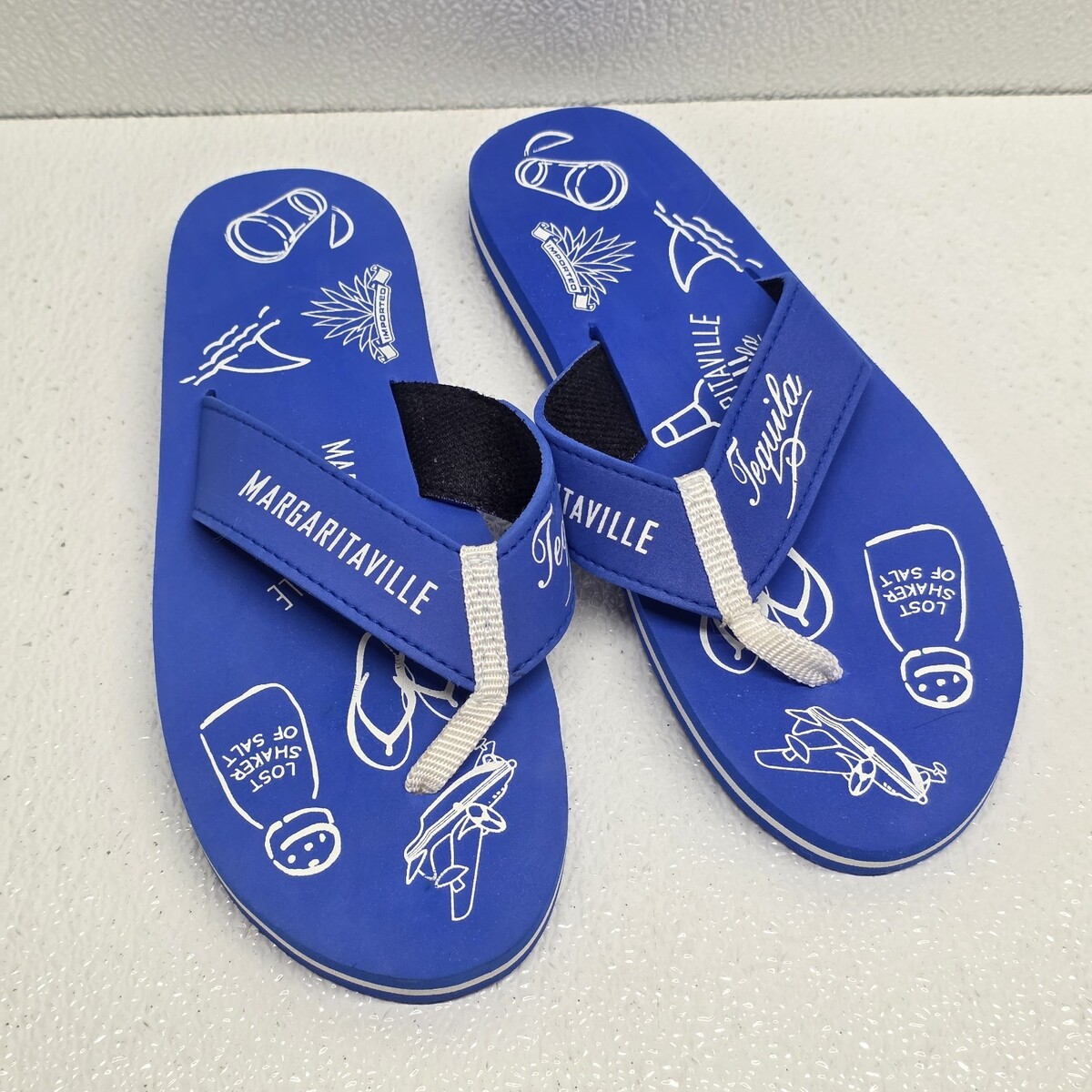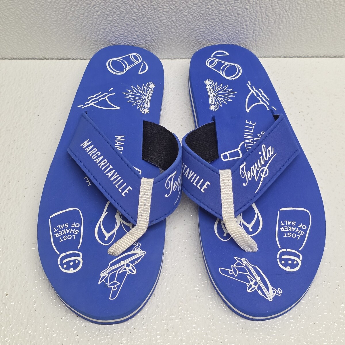 Jimmy Buffet Margaritaville Tequila Lost Shaker Of Salt Blue Womens Size 8 / 9 Flip Flops. Small defect on one strap, see images for condition. Images show actual shoes that will ship.