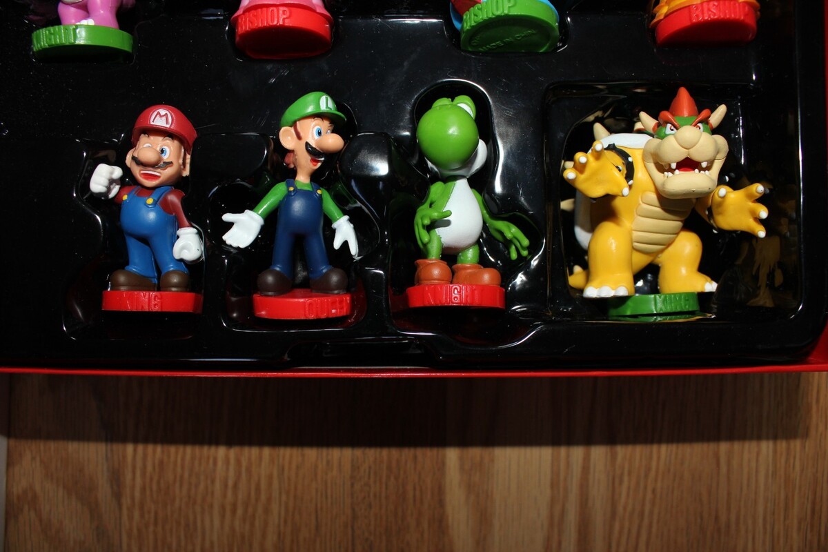 Popular Super Mario characters represent traditional chess pieces: Mario, Luigi, Princess Peach, Yoshi, Toad, 1-Up Mushroom, Bowser, Bowser Jr, Birdo, Goomba, Hammer Bros, and Magikoopa
