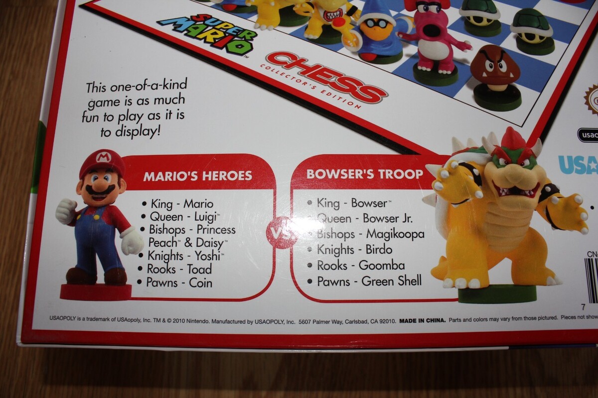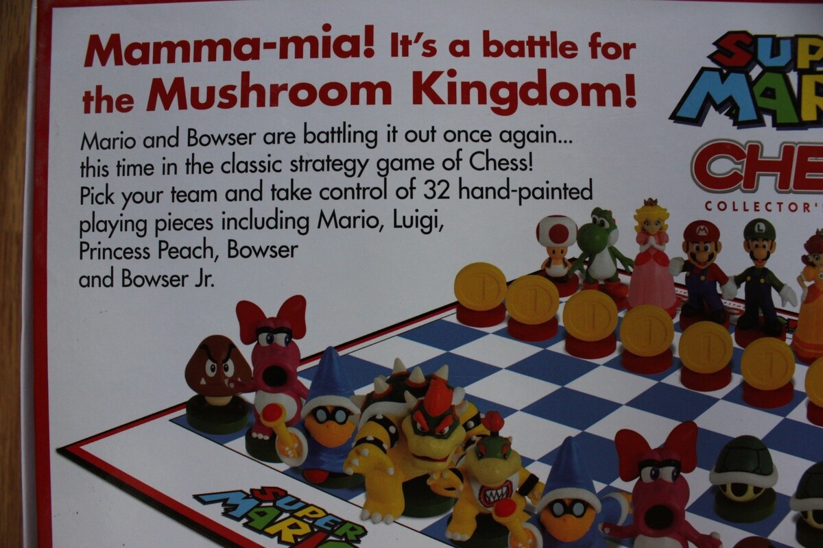 With Super Mario Chess, Mario and Bowser are once again battling for the Mushroom Kingdom, this time through the classic strategy game of chess. Pick your team and take control of 32 hand-painted playing pieces. This one of a kind game is as much fun to play as it is to display. The Super Mario Bros. Collector's edition of the chess game is the ultimate strategy game featuring the most beloved and popular Super Mario Bros.