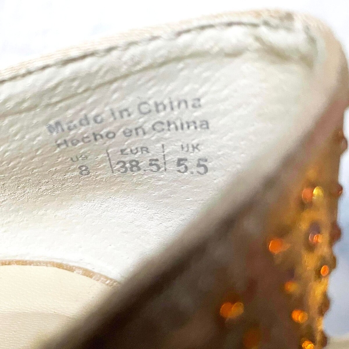 Aldo women's size 8M gold satin platform pumps. Gold satin upper with rhinestones on peep toes. Stiletto heel and heel counter are also embellished with rhinestones. Excellent condition with small scuff in insole.