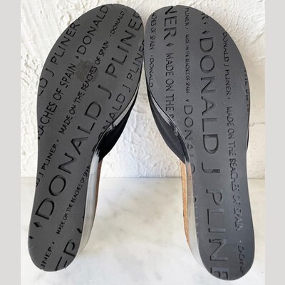 Donald J Pliner women's size 7-1/2 slip on wedge heel sandals. Excellent condition, only worn once. Black fabric strap with center DJP logo. Black patent leather covered cork wedge heel and rubber sole.