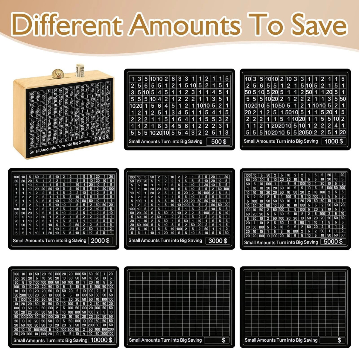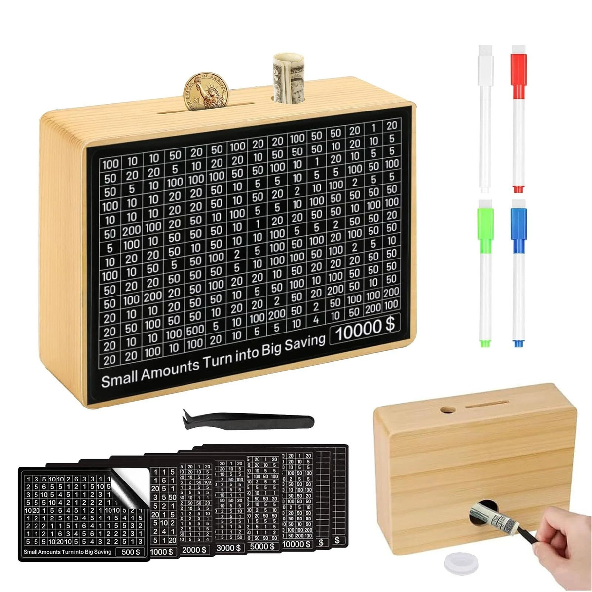 ?CUSTOMIZED SAVINGS POT?Our upgraded wooden savings jar makes saving more fun with 4 colorful wipe-dry markers and six different savings goal stickers ($500, $1,000, $2,000, $3,000, $5,000, $10,000) as well as two customizable savings amount labels so you can DIY your own savings amount.