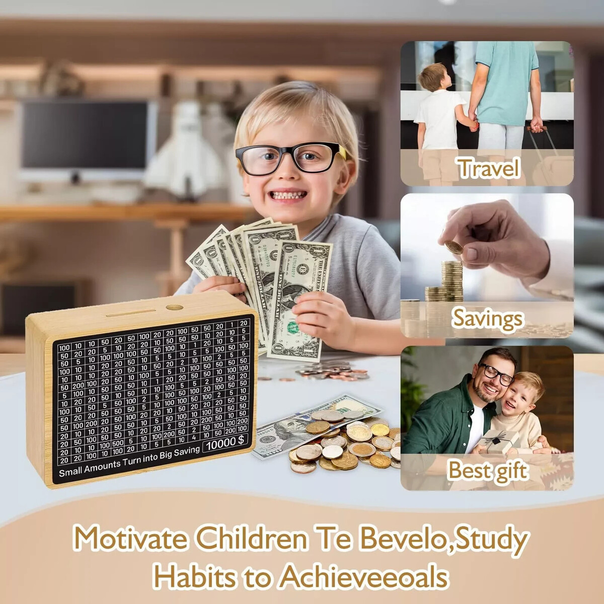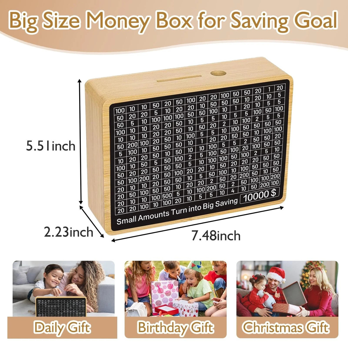 ?Popular Money Bank?Our upgraded wooden money bank is suitable for people of any age, it is a great financial tool for people of all ages as it can raise financial awareness, challenge people's desire to save money, take control of their finances and invest in a better financial future.