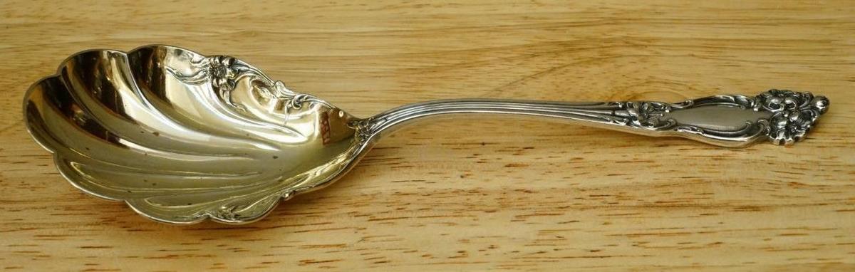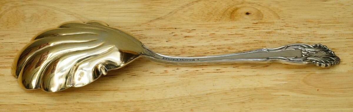 Reed Barton Silverplate Gold Wash Solid Shell Tiger Lily Berry Serving Spoon, 1901, measures 9-1/8" long. No smoke or pet odor.