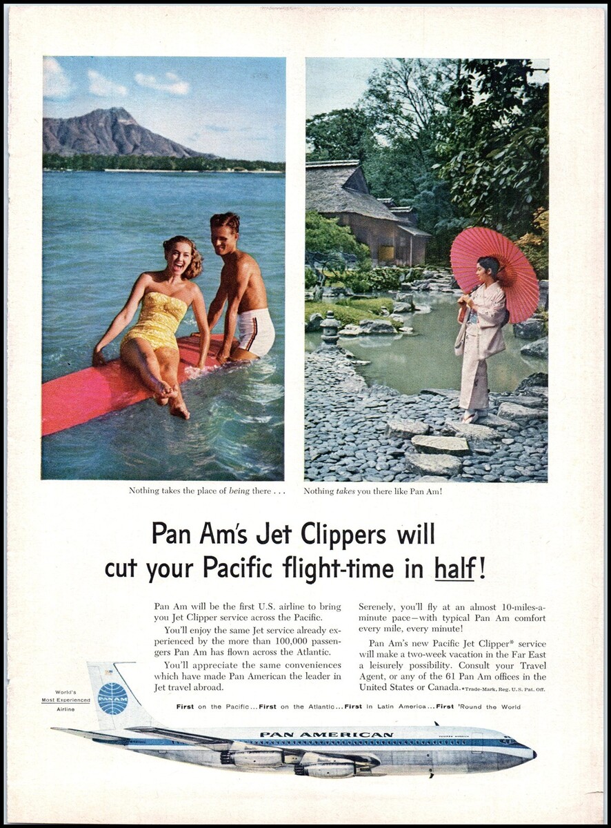 1950s Pan Am PRINT AD Pan Am's Jet Clippers Cut Pacific Flight Time In Half BX2