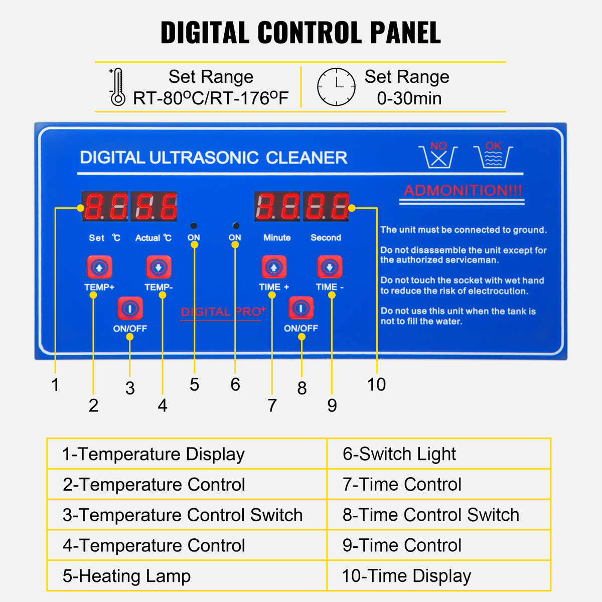 ?CONTROL PANEL?- Digital display and control panel for precise washing time and temperature control. Button adjustment, a commercial ultrasonic cleaner is simple and easy to operate.